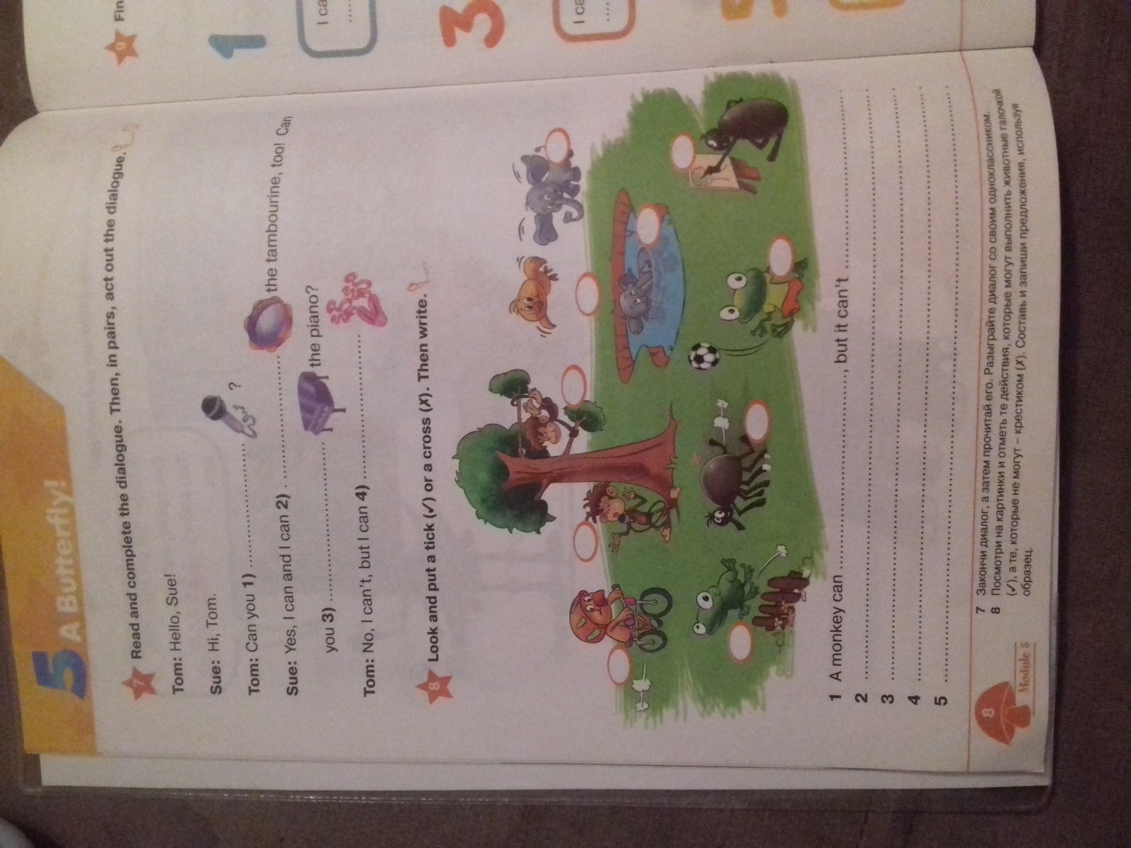 7упр1-sing.2,3-play.4-dance.8 упр .a monkey can jump,but it can't sing.a bird can fly,but it can't by bycikle.a elephant can swim,but it can't fly.a frog can jump, but it can't play ball. a spider can work,but it can't draw.