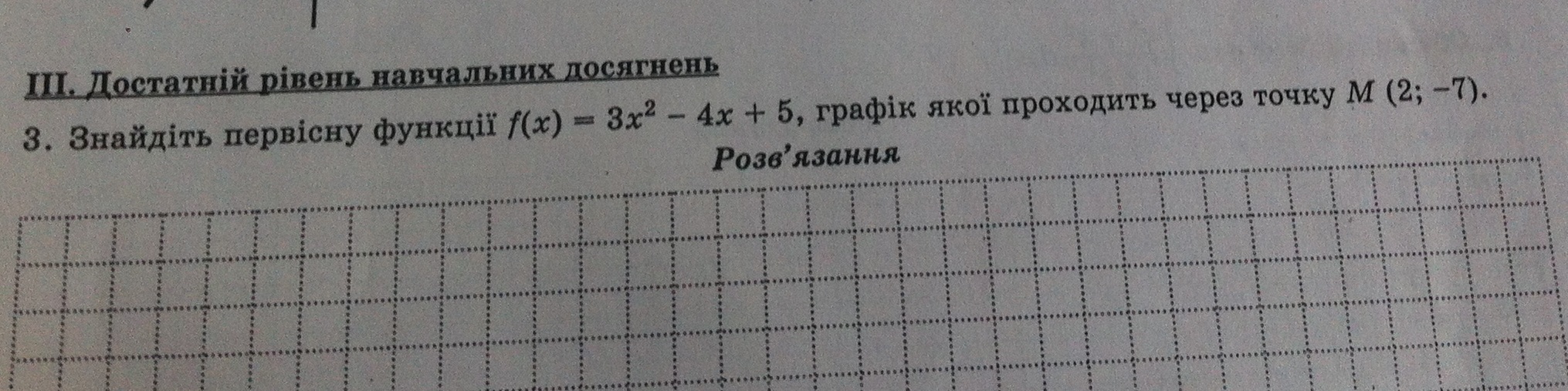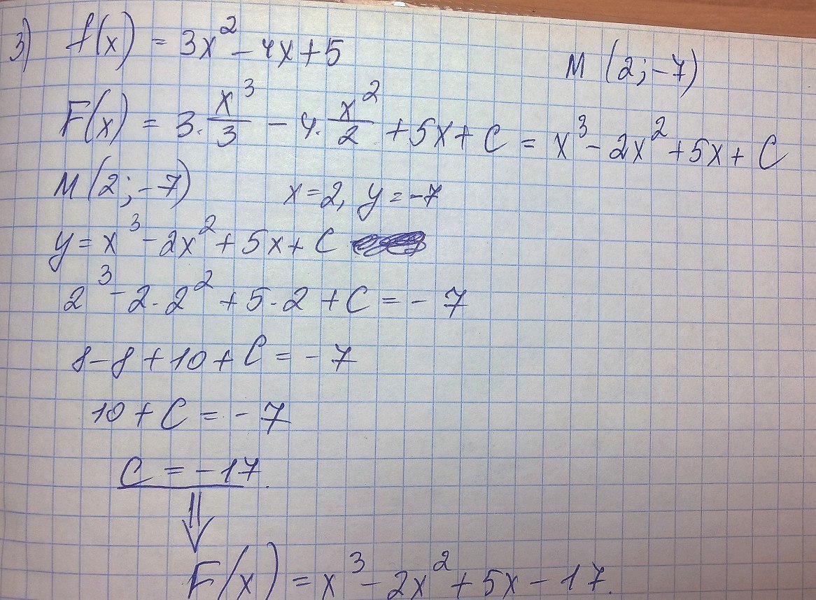 3. Найдите первообразную функцию f(x)= 3x^2-4x+5, график которой проходит через точку М (2, -7)
