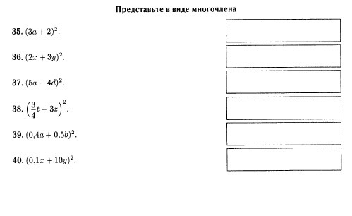 35. (3а + 2)² = (3a)² + 2 × 3a × 2 + 2² = 9а² + 12а + 4