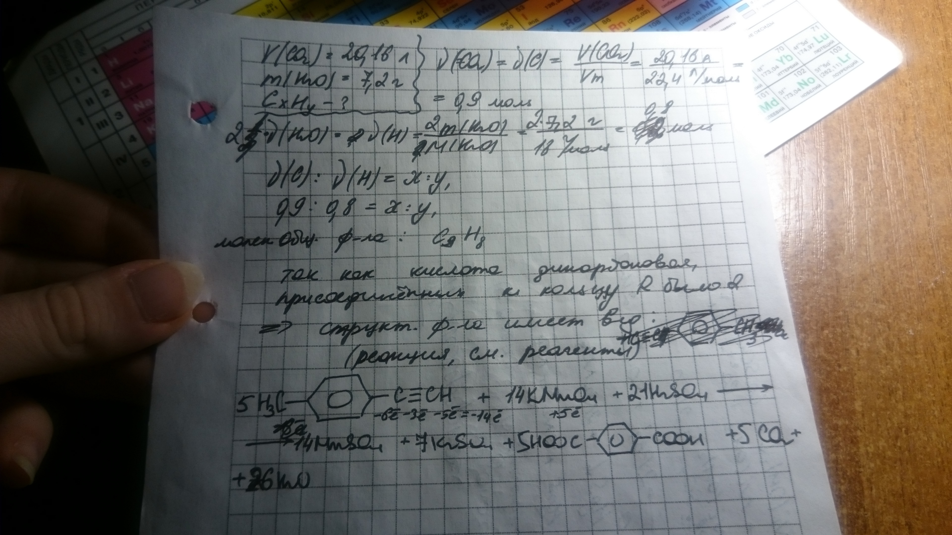 При сжигании паров углеводорода было получено 20,16 л(н.у.) СО2 и 7,2 г воды. При окислении углеводорода горячим подкисленным раствором перманганата калия образуется терефталевая кислота ( бензол-1,4-дикарбоновая ). Определить молекулярную формулу углеводорода.