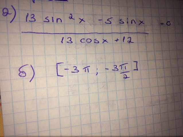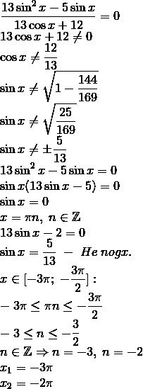 frac{13sin^2x-5sin x}{13cos x+12}=0\13cos x+12neq0\cos xneqfrac{12}{13}\sin xneqsqrt{1-frac{144}{169}}\sin xneqsqrt{frac{25}{169}}\sin xneqpmfrac5{13}\13sin^2x-5sin x=0\sin x(13sin x-5)=0\sin x=0\x=pi n,;ninmathbb{Z}\13sin x-2=0\sin x=frac5{13};-;He;nogx.\xin[-3pi;;-frac{3pi}2]:\-3pileqpi nleq-frac{3pi}2\-3leq nleq-frac32\ninmathbb{Z}Rightarrow n=-3,;n=-2\x_1=-3pi\x_2=-2pi