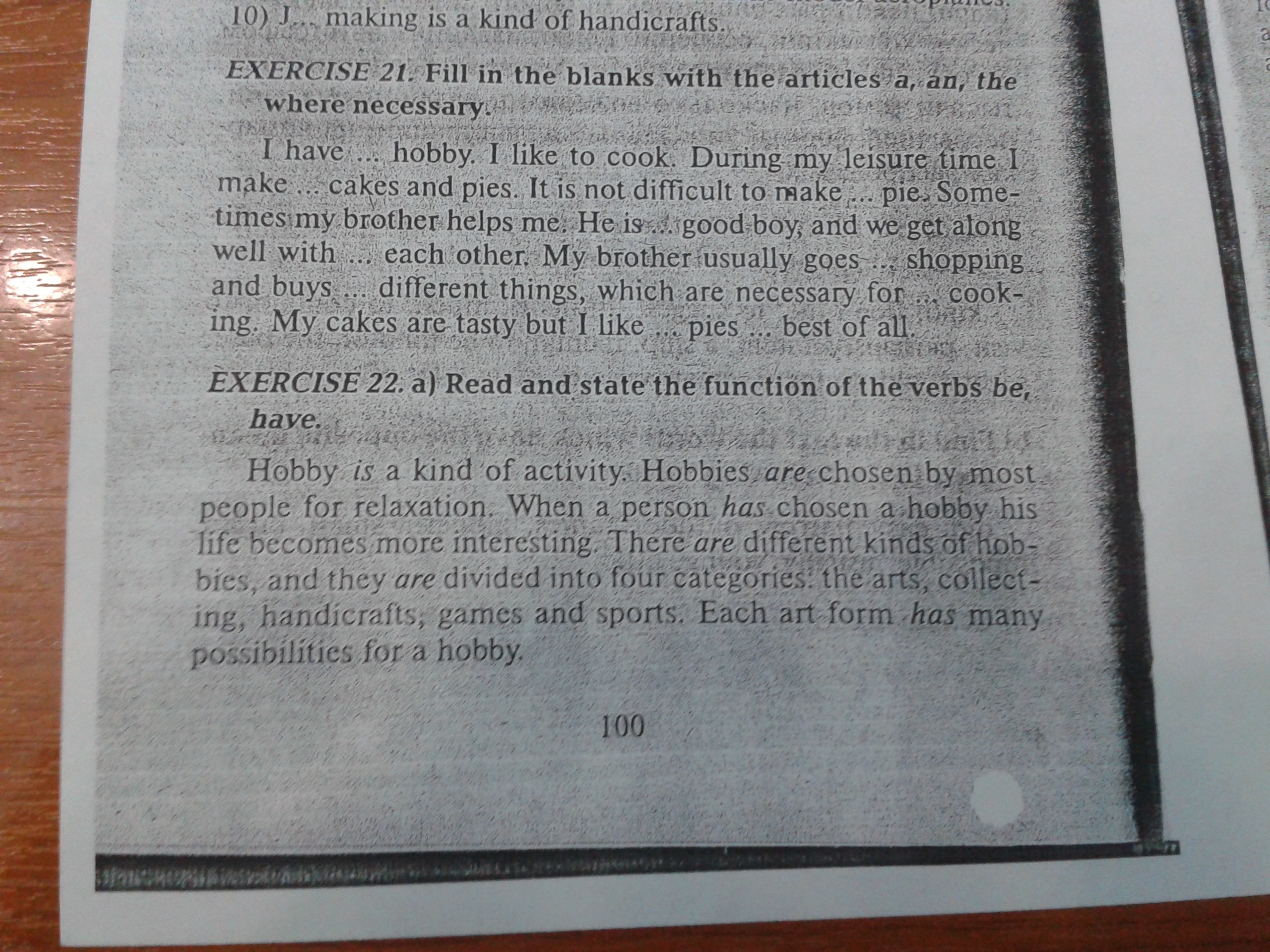 Hobby is (linking verb) a kind of activity. Hobbies are (auxiliary verb) chosen by most people for relaxation. When a person has (auxiliary verb) chosen a hobby his life becomes more interesting. There are (main verb, special type of predicate) different kinds of hobbies, and they are (auxiliary verb, passive voice) divided into four categories: the arts, collecting, handicrafts, games and sports. Each art form has (main verb) many possibilities for a hobby.