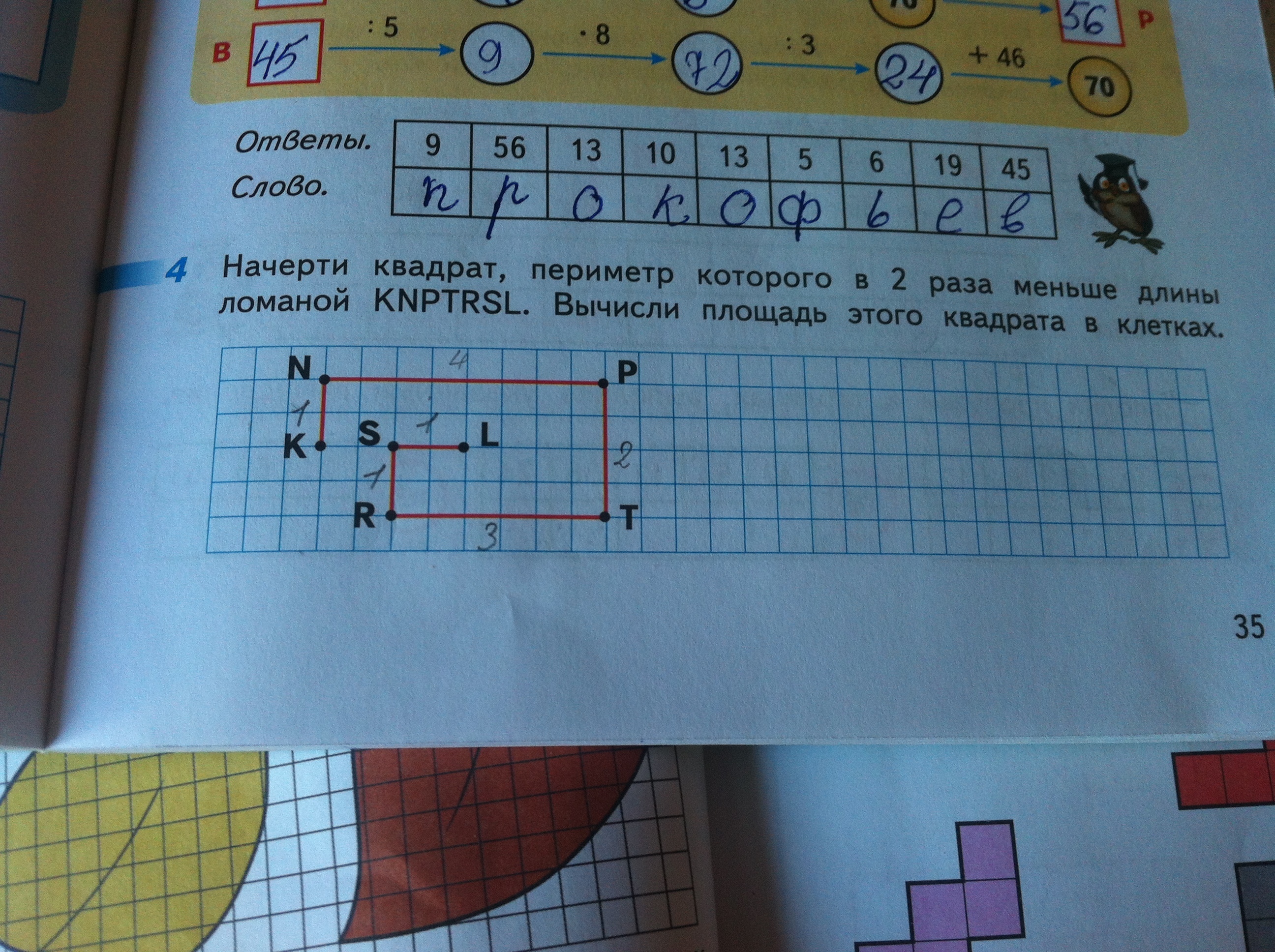 Сказано, что периметр квадрата в 2 раза меньше длины данной ломанной линии, следовательно 12см делим на 2 равно 6см или 12 клеток.