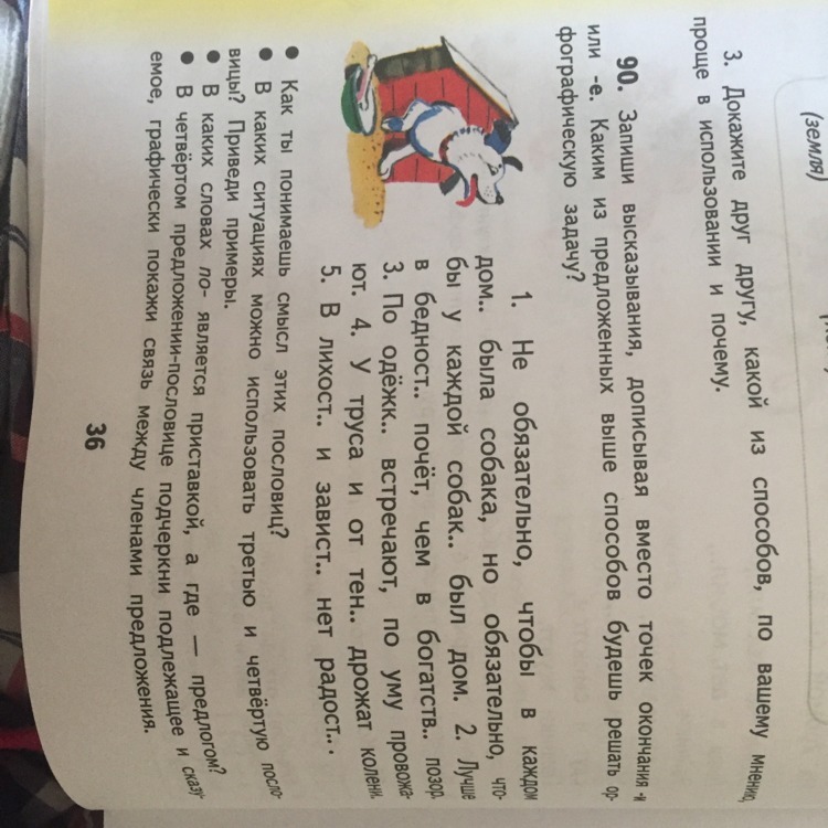 1. Не обязательно, чтобы в каждом дом... была собака, но обязательно, чтобы у каждой собак... был дом. 2. Лучше в бедност... почёт, чем богатств... позор. 3. Поодёжк... встречают, по уму проважают. 4. У труса и от тен... дрожат колени. 5. В лихост... и завист... нет радост...