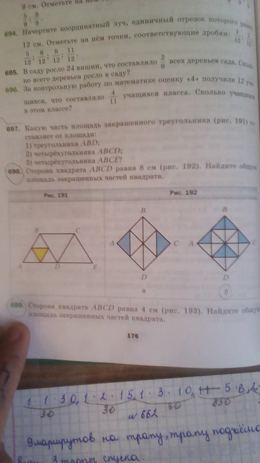 Сторона квадрата АВСD равна 8 см (рис. 192) Найтиде общую площадь закрашенных честей квадрата . Под буквой б.
