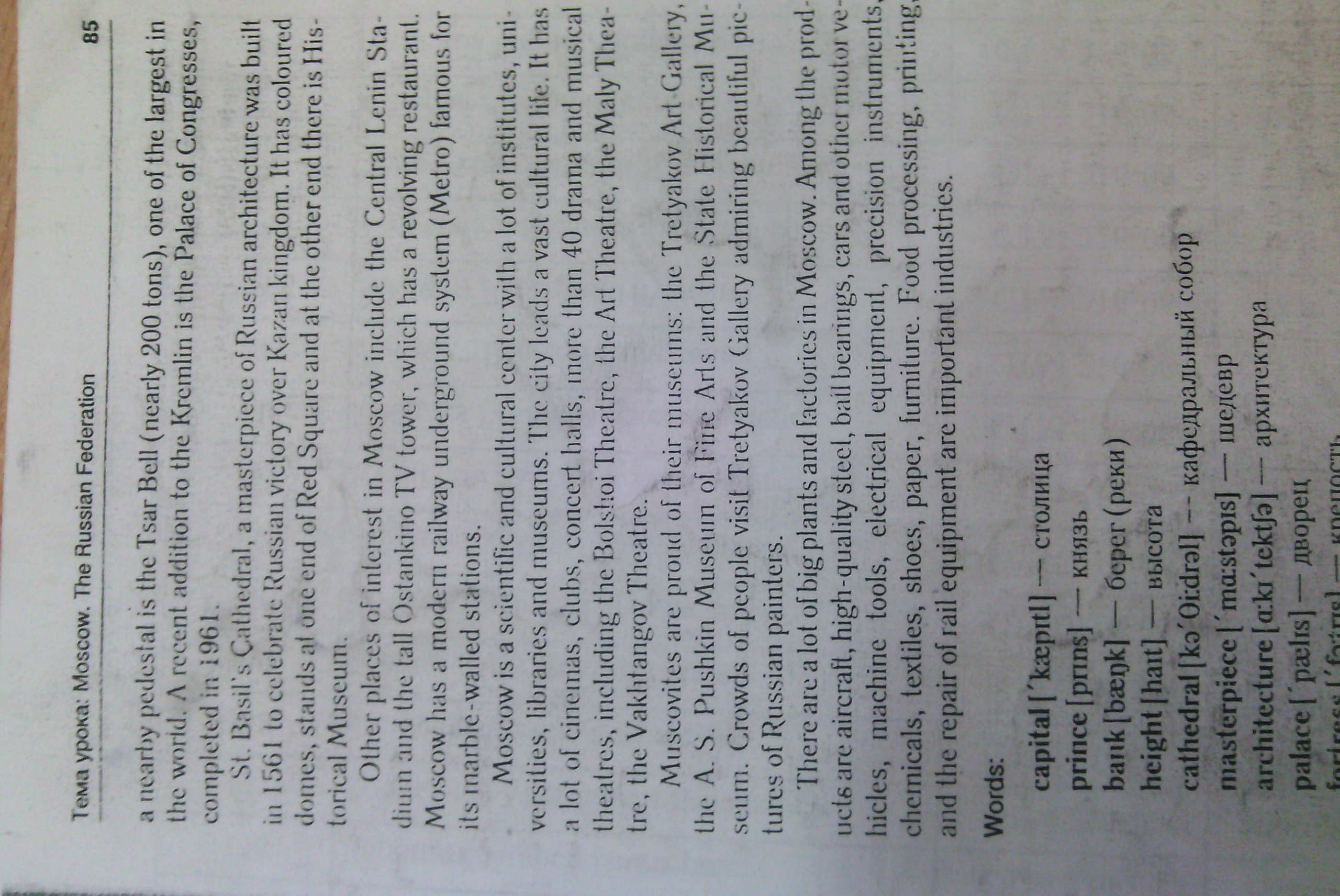 Соседний постамент царь-Бел (почти 200 тонн), один из крупнейших вмира. Недавнее дополнение к Кремля находится Дворец конгрессовЗавершено в 1961 годуСобор Василия Блаженного, шедевр о! Был построен русской архитектурыв 156l, чтобы отпраздновать победу русских над Казанью! королевства. Он имеет цветнойкупола, стоит ал одном конце Красной площади и на другом конце его-музей историческихДругие достопримечательности в Москве включают в себя Центральный Ленина ста-diuin и высокий Останкинская телебашня, которая имеет вращающийся ресторанМосква имеет современную! подземная железная дорога (метро) известных (илисвоими мраморными стенами станций.Москва является научным и культурным центром с много институтов, уни-верси лжи, библиотек и музеев. Город ведет обширную культурную жизнь. Он имеетмного о! кинотеатры, клубы, концертные залы, Inore (более 40 draina и музыкальныетеатры, в том числе Большого театра, искусство театр, Малый Теа-(дерево, театр Vakhtangoy.Москали pro1udl о! (musetuins наследник: (Третьяковская галерея(А. С. Пушкин Musetuin из! Filie искусств и Государственной Hlistorical мил-Селим. Толпы! люди посещают Третьяковская (1allery любуясь красивый пирогтурес русских художников.Есть много больших заводов и фабрик в Москве. Среди прод-спкт самолеты, высококачественной стали, подшипники залог, автомобили и другие моторные ве-вый, станки, электрооборудование, точные приборыхимикаты, текстиль, обувь, бумага, мебель. Пищевая, полиграфическаяи (он ремонт железнодорожного оборудования являются важными отраслямиСлова:капитал! держится!капиталпринц ПринсПринцбанк (bepkберег (реки)высота (шляпа) высотакафедральный собор (в Oidral-- Соборшедевр "mastopisархитектура отсутствие архитектуры tektfalдворец палс Abopet.