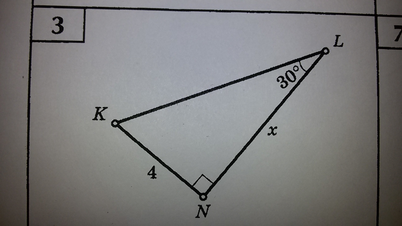 Гипотенуза KL=2KN=2*4=8 (т.к. гипотенуза вдвое больше катета напротив 30°);треугольник прямоугольный,тогда по теореме Пифагора х^2=KL^2-KN^2