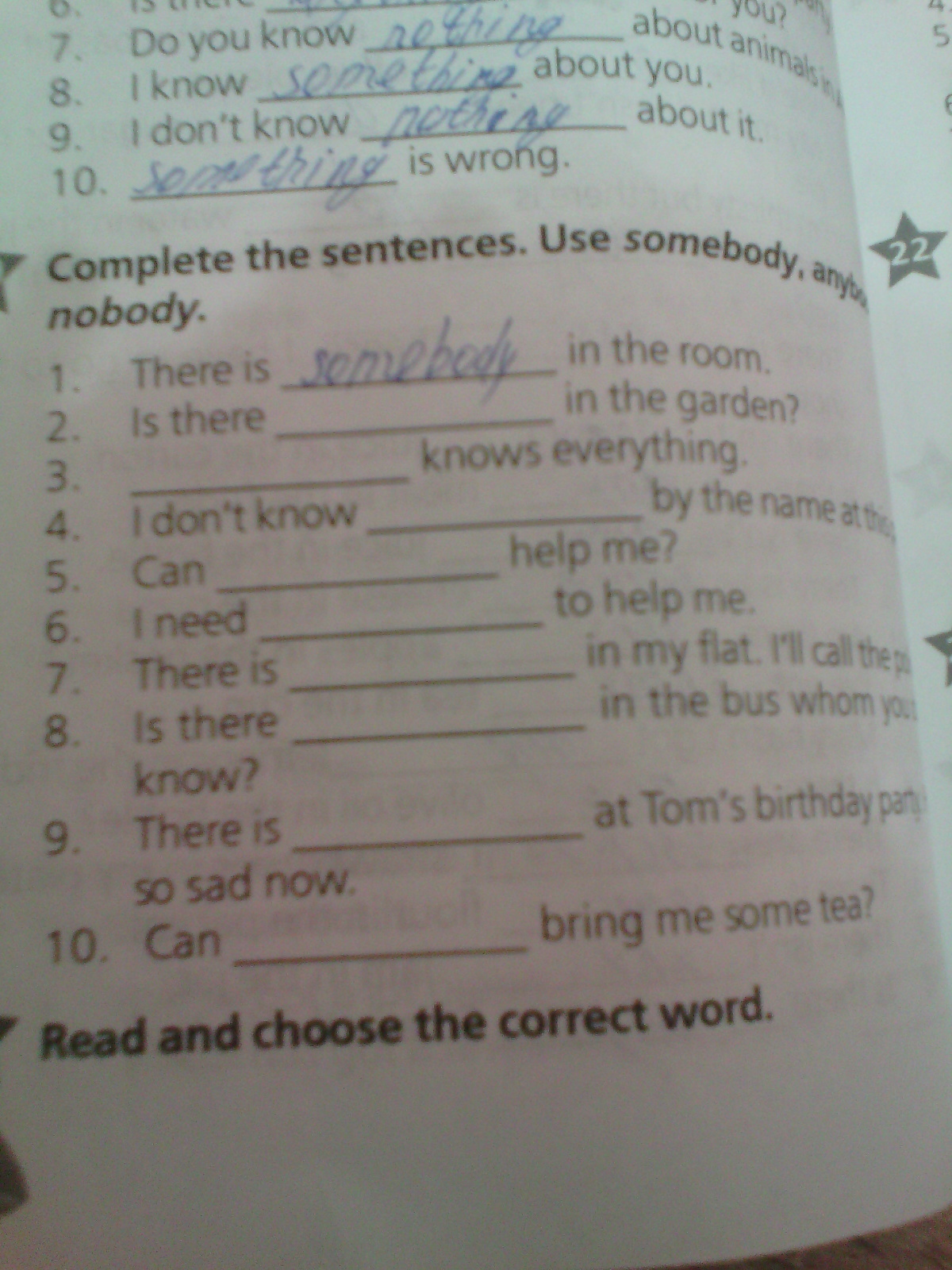 1. There is nobody in the room. 2. Is there anybody in the garden? .3 Nobody knows everything. 4. I don't know anybody by the name at this party. 5. Can anybody help me? 6. I need somebody to help me. 7. There is somebody in my flat.I' ll call the police. 8. Is there anybody in the bus whom you don't know? 9. There is nobody at Tom's birthday party.He is so sad now. 10. Can anybody bring me some tea?