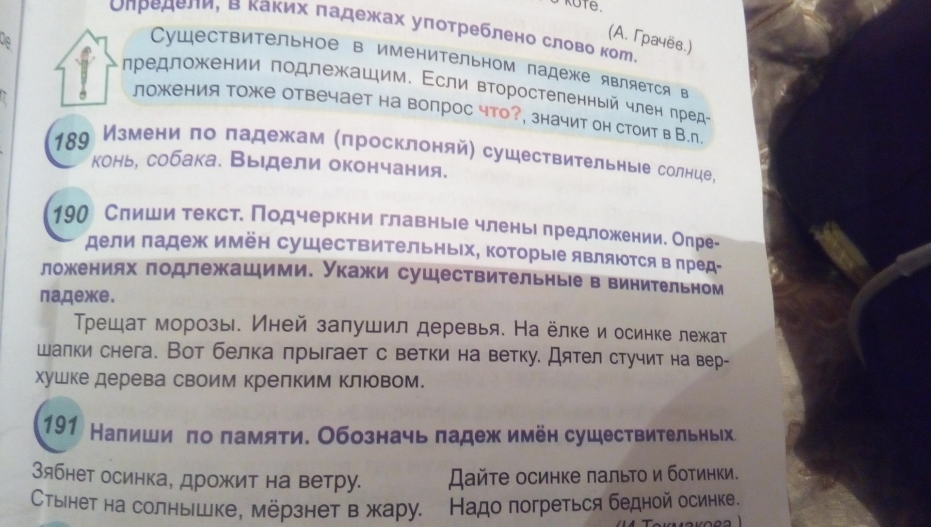 Трещат(сказ) морозы(подл, Им. падеж). Иней(подл, Им. пад) запушил (сказ) деревья (Вин. п). На елке и осинке лежат(сказ) шапки(подл, им. пад) снега. Вот белка(подл, им.п) прыгает(сказ) с ветки на ветку(Вин. п). Дятель (подл,им.п) стучит(сказ) на верхушке дерева своим крепким клювом.