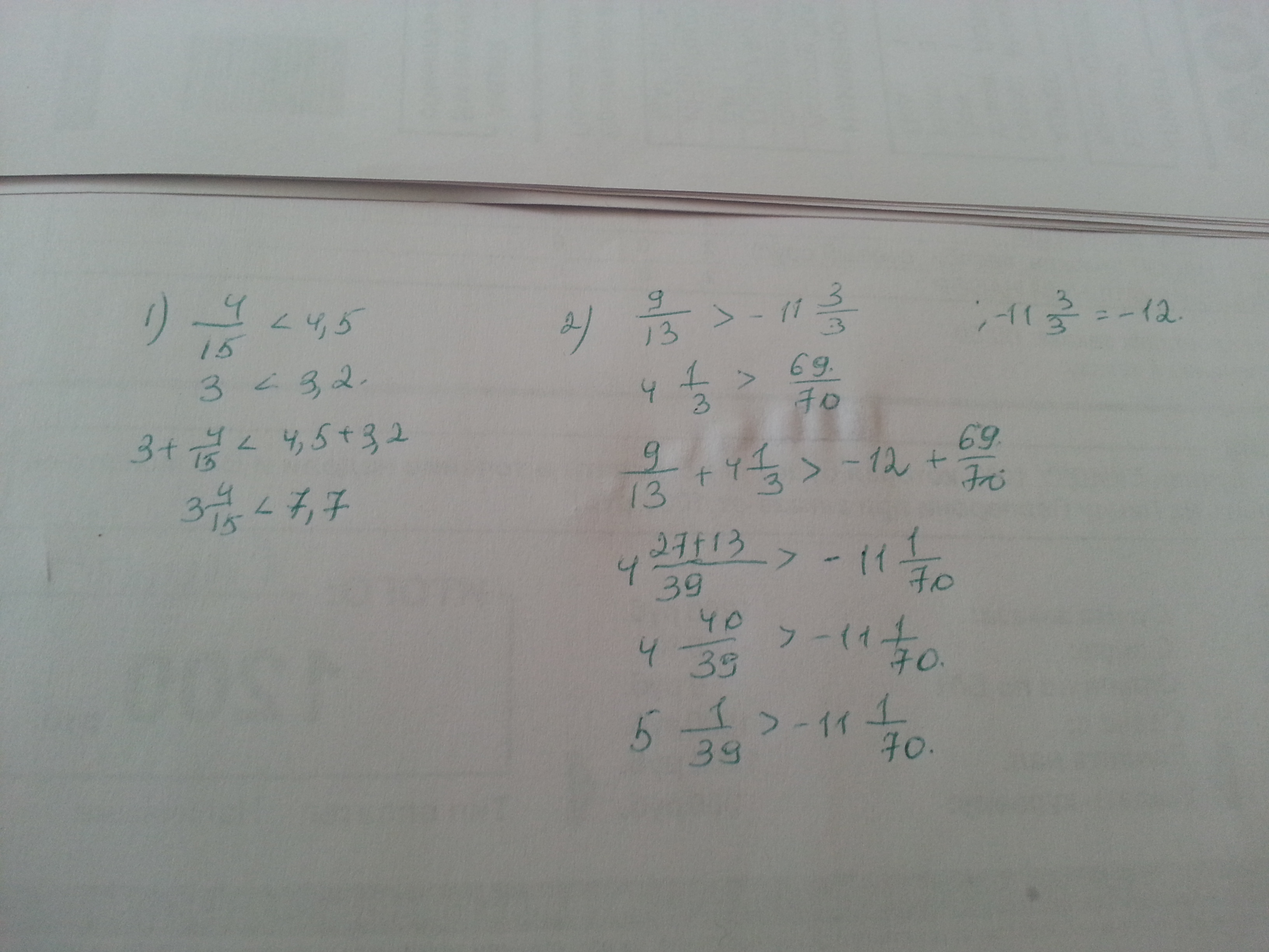 выполните сложение неравенств: 4/15 < 4,5 и 3 < 3,2; -6 9/13> -11 3/3 и 4 1/3 > 69/70