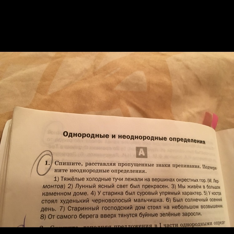 тяжёлые, холодные тучи лежали на вершинах гор.( однородные) Лунный ясный свет был прекрасен.( неоднородные) Мы живём в большом каменном доме.( неоднородные) У старика был суровый, упрямый характер.( однородные) У костра стоял худенький черноволосый мальчишка.( неоднородные) Старинный господский дом стоял на небольшом возвышении.( неоднороднве) От самого берега вверх тянутся буйные зелёные заросли.( вроде неоднородные).