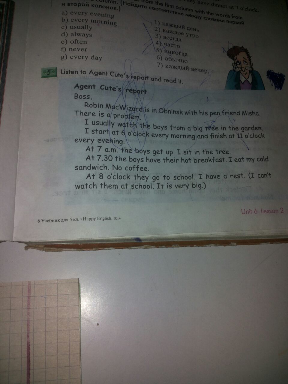 доклад Робин Mac Izard в Обнинске с его пера друг Миша. Существует проблема. это я обычно TEEE Wd в саду. ребята из большой я начинаю в 6 о Ock каждое утро и заканчиваются в 11 часов о. каждый вечер в 7 часов утра ребята встают. Я сижу в дереве. В 7.30 мальчики имеют свой горячий завтрак. есть мой холодный бутерброд. Нет кофе. В 8 часов они идут в школу. Я отдыхаю. (Г carit смотреть их в школе. Это очень большая.)