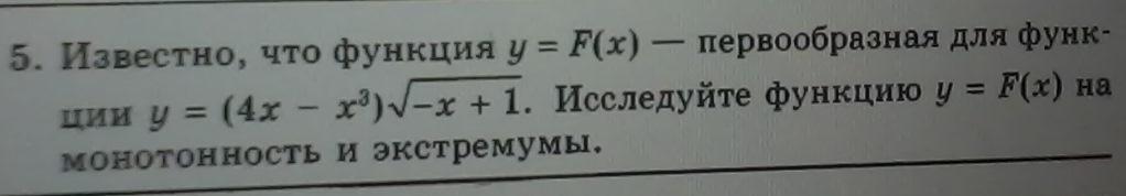 Поскольку F(x)является первообразной функции f(x), выполнено F'(x)=f(x). Для исследования функции на монотонность и точки экстремумы нужно вычислять производную, приравнивать ее к нулю, искать участки знакопостоянства. Производную нам вычислять не нужно, она нам дана по условию. Ищем ее область определения, нули, участки знакопостоянства. Область определения: x≤1.
