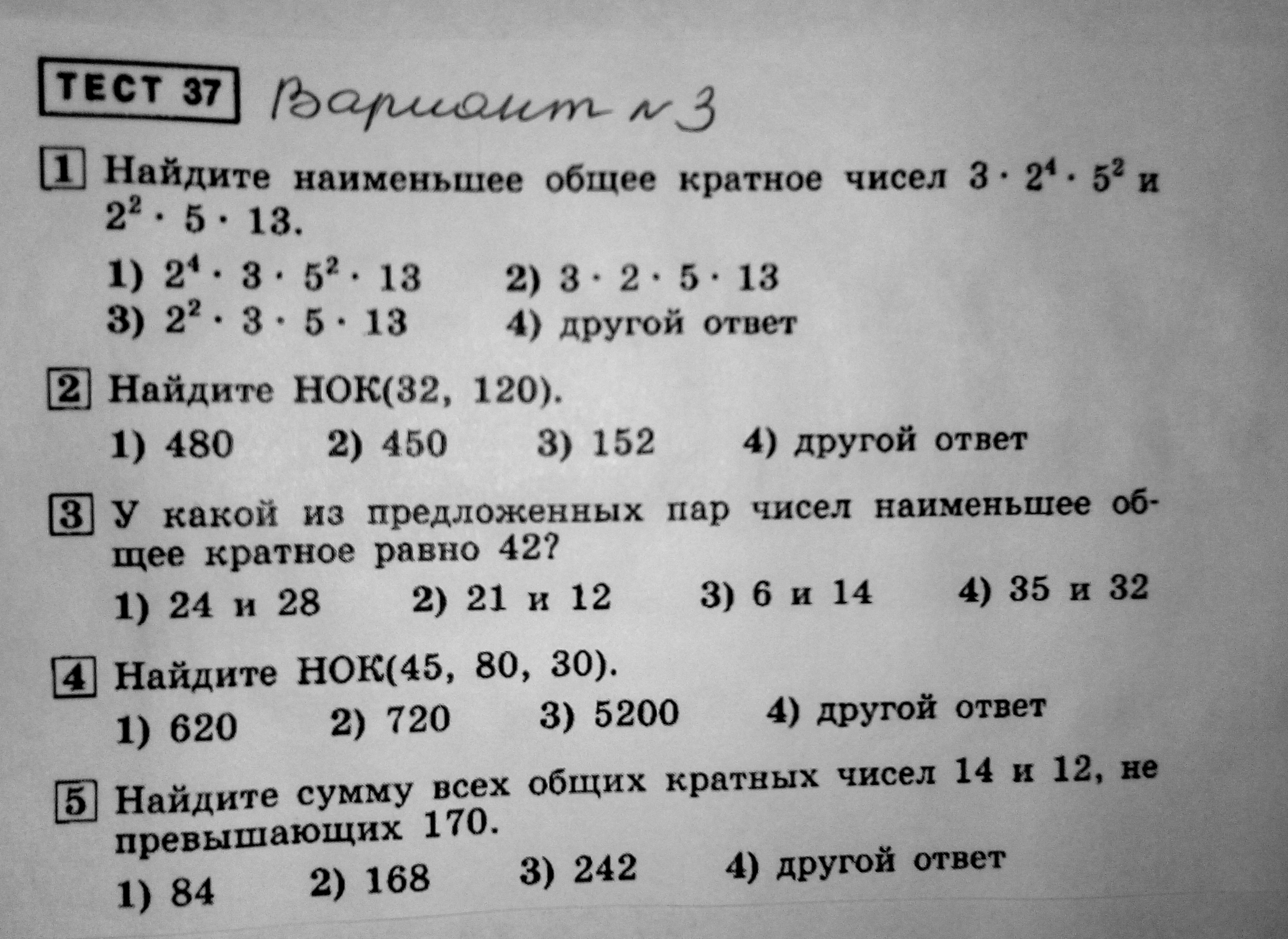 1) 2^4*3*5^2*13 отв.1 2)нок(32,120)=2^5*3*5=480 отв 1 3) 6=2*3 14=2*7 нок(6,14)=2*3*7=42 отв.3 4) нок(45,30,80)=2^4*3^2*5=16*9*5=720 отв.2