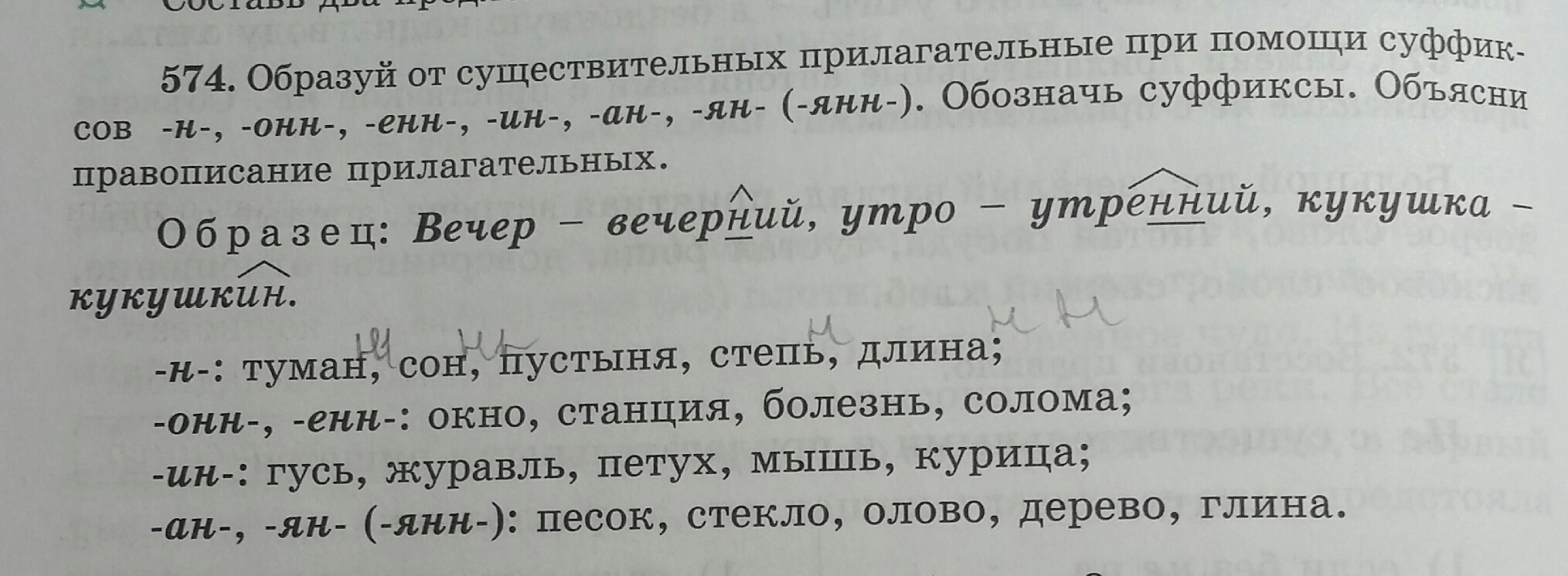 -ан-, -ян- (янн): песчаный, стекляный, деревянный, глиняный.