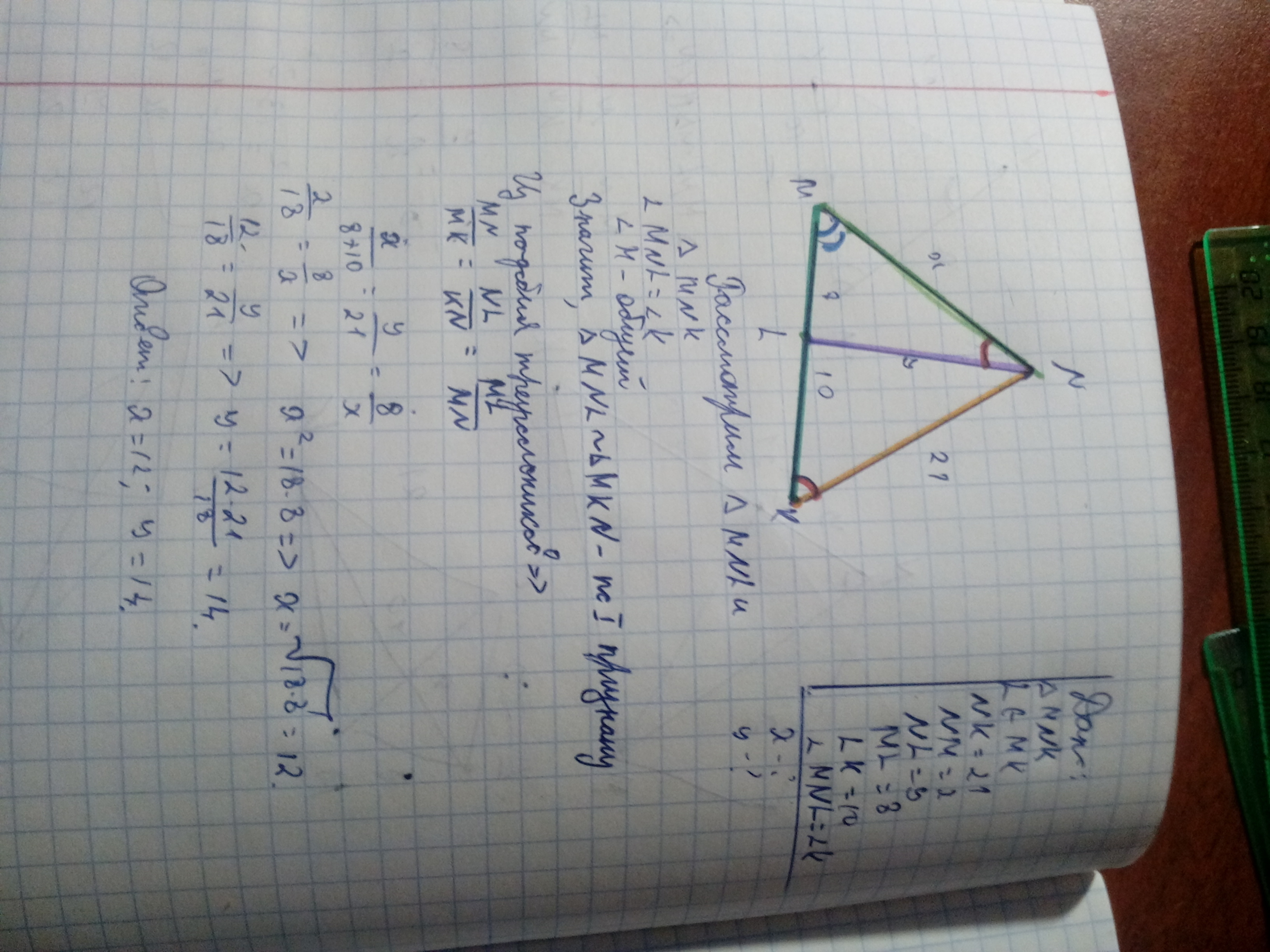 1. Есть треугольник MNK, NK = 21, NM = x, NL =y, ML = 8, LK = 10, угол MNL = углу K. Найти х, у.