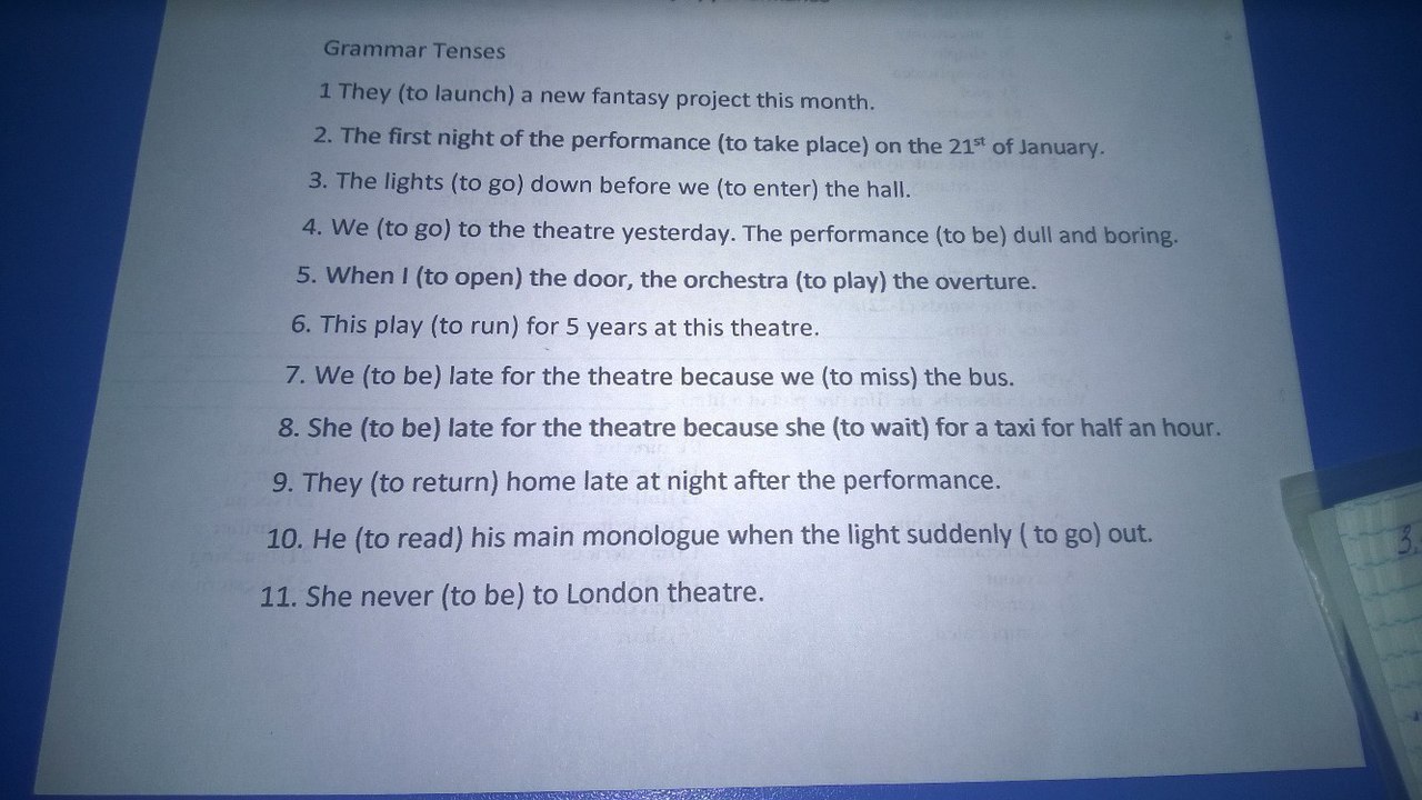 1. Launched2. will take3. had gone, entered4. went, was5. had opened , was playing6. had been running7. missed, had missed8. was, has been waiting9. returned10. was, had gone11. had never been