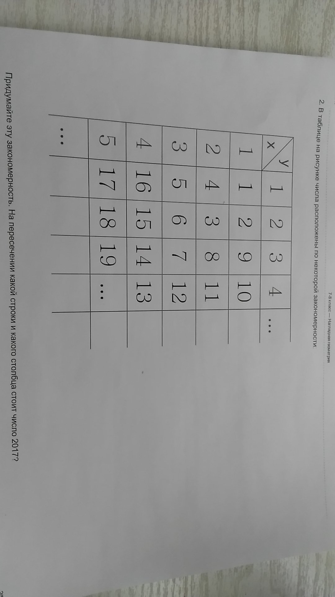 Подбором выявляем число, которое в квадрате дает значение близкое к 2017 - это 45 в квадрате = 2025 - это значение будет находиться в первой строчке в 45 столбце, а значение 2017 - будет в этом же столбце, но на девятой строчке, так как 2025 - 2017 = 8, но 2025 уже занимает строчу 1 - поэтому строка = 8 + 1 = 9.