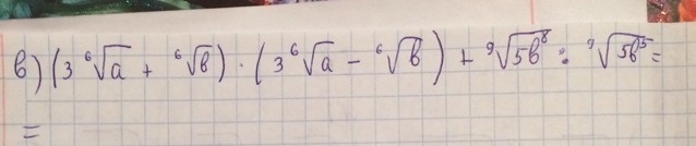 (3 sqrt[6]{a}+sqrt[6]{b} )(3sqrt[6]{a}-sqrt[6]{b})+sqrt[9]{5b^8}:sqrt[9]{5b^5}=(3 sqrt[6]{a})^2-(sqrt[6]{b})^2+  sqrt[9]{frac{5b^8}{5b^5} } = \  \ =9 sqrt[3]{a}- sqrt[3]{b}+ sqrt[9]{b^3}=9 sqrt[3]{a}- sqrt[3]{b}+ sqrt[3]{b} =9 sqrt[3]{a}