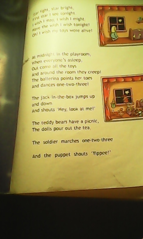 в полночь в игровой комнате, когда все спят, выходят все игрушки и ползают по комнате, балерина указывает пальцами ее ног и танцует. клоун из коробки выпрыгивает и кричит "Ээй, посмотрите на меня!". мишки сидят на пикнике, куклы попивают чай. солдатики маршируют, марионетка кричит "Ура!"