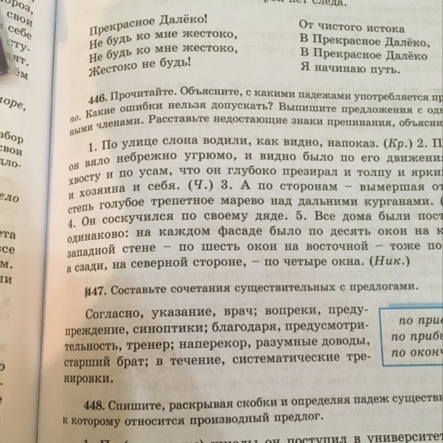 Согласно указанию врача, вопреки предупреждению синоптиков, благодаря предусмотрительности тренера, наперекор разумным доводам старшего брата, в течение систематических тренеровок