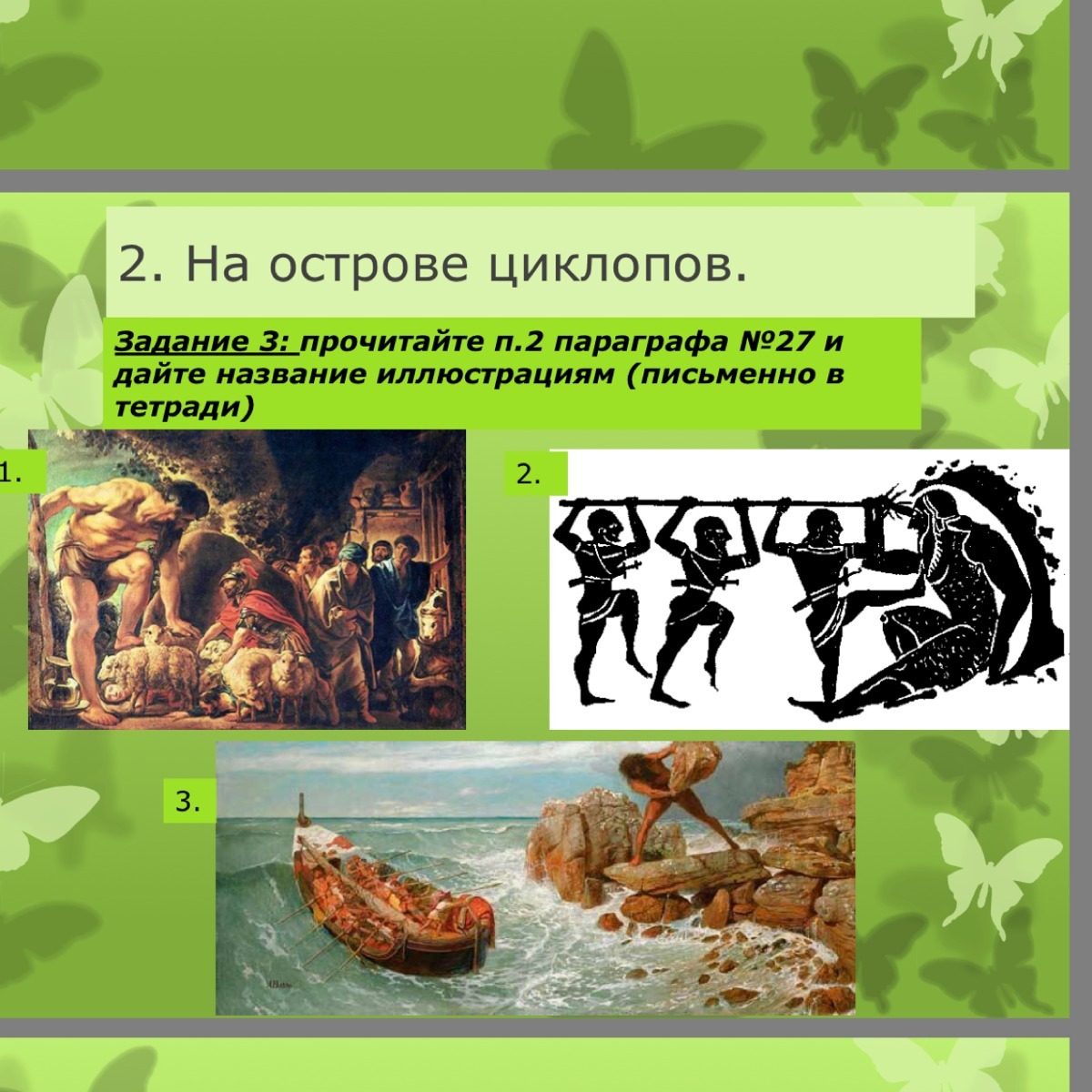 1.Спасение Одиссея из пещеры Полифема.Одиссей и его спутники покидают пещеру Полифема.Огромный циклоп Полифем уже слепой