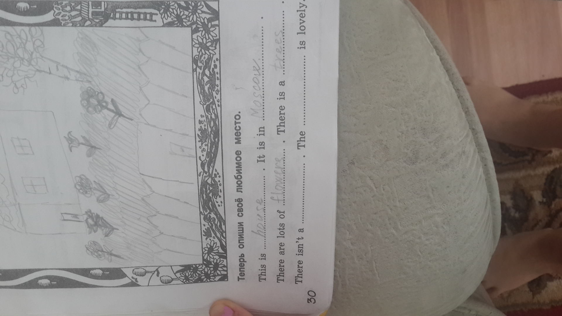 This is house.It is in Moscov.There are lots of flowers.there is a trees.there isn't a..................The..............is lovely.продолжите пожулуйста пропушенных местах.