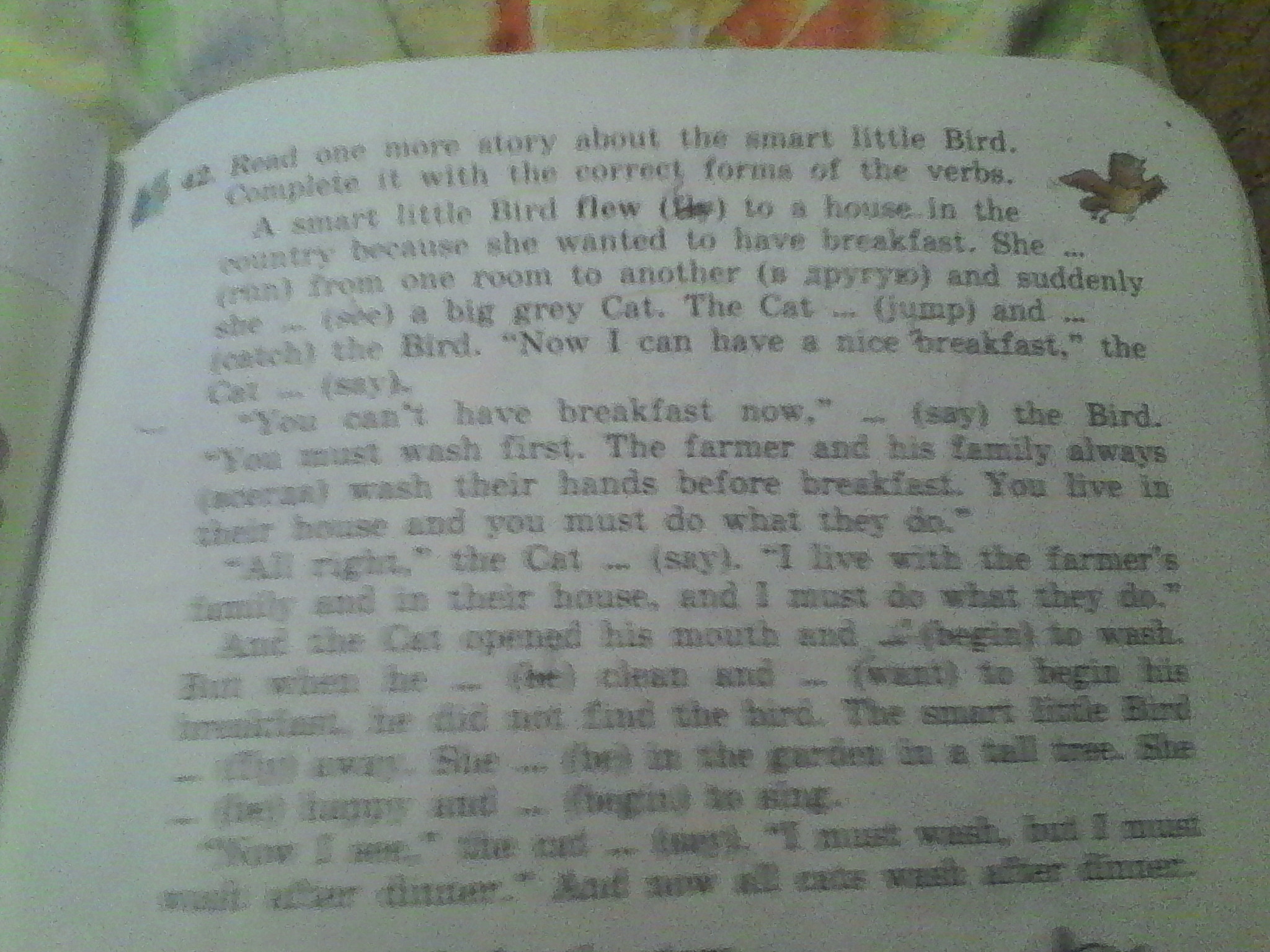 Умная маленькая птичка летала в деревню чтобы позавтракать.Она влетела в комнату и увидела большую серую кошку.Кошка прыгнула и поймала птичку."Теперь я могу позавтракать "сказала кошка." Ты не сможешь позавтракать,"сказала птичка."Сначала ты должна умыться.Фермер и вся его семья всегда моют руки перед едой.Ты живёшь в их доме и ты должна выполнять то что делают они.""Это правильно"сказала кошка."Я живу в доме фермера и я должна делать то что делают мои хозяева"И кошка стала умываться.Но когда она была чистой и хотела уже позавтракать,она не нашла птички.Умная птичка улетела прочь.Она была на высоком дереве в саду.Она была счастлива и начала петь."Теперь я вижу",сказала кошка."Я должна мыться только после еды."С тех пор все кошки моются после еды.