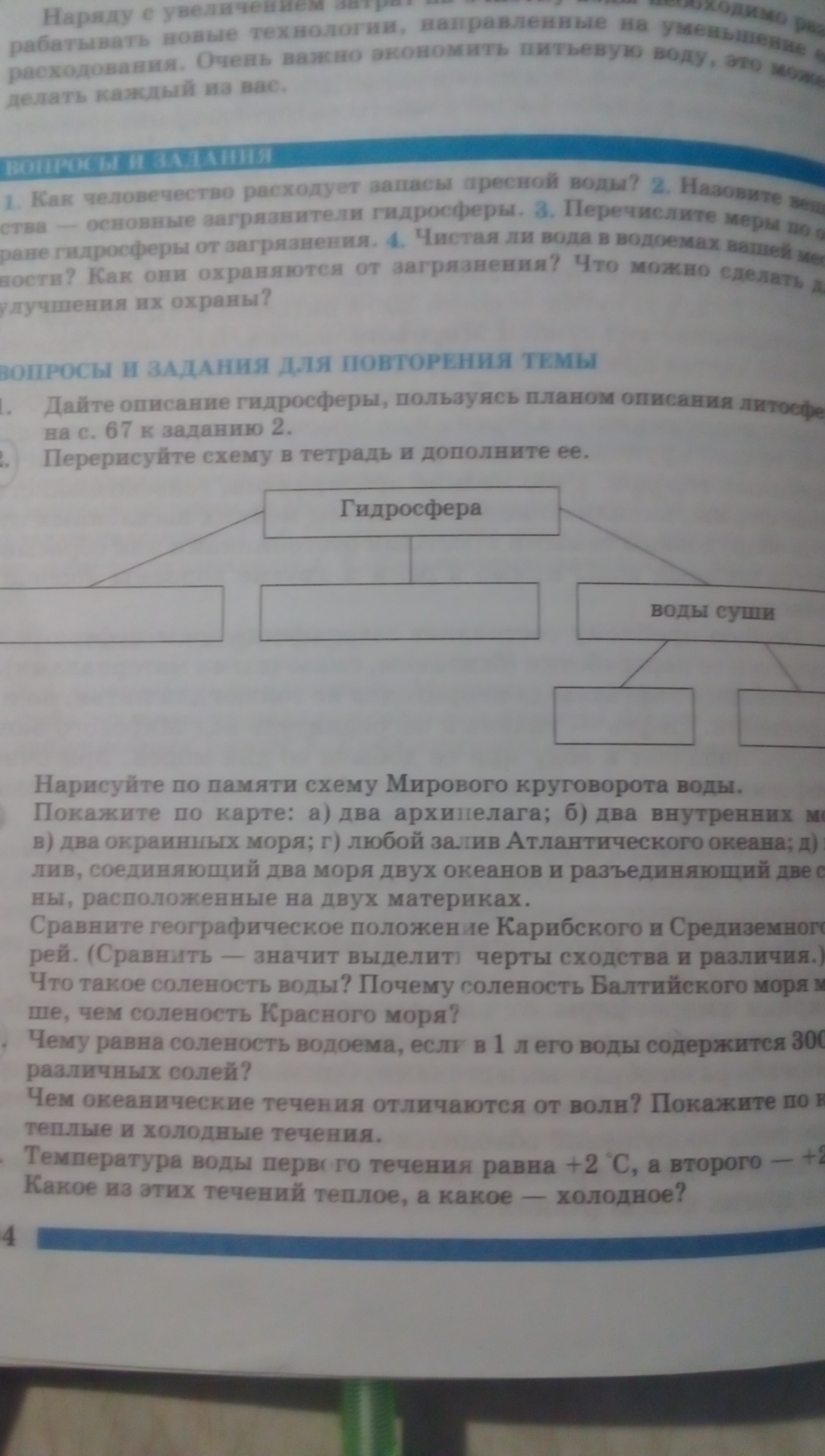 Воды суши: Подземные (межпластовые, грунтовые) и Наземные (реки, озера, водохранилища, болота, многолетняя мерзлота, ледники, пруды)