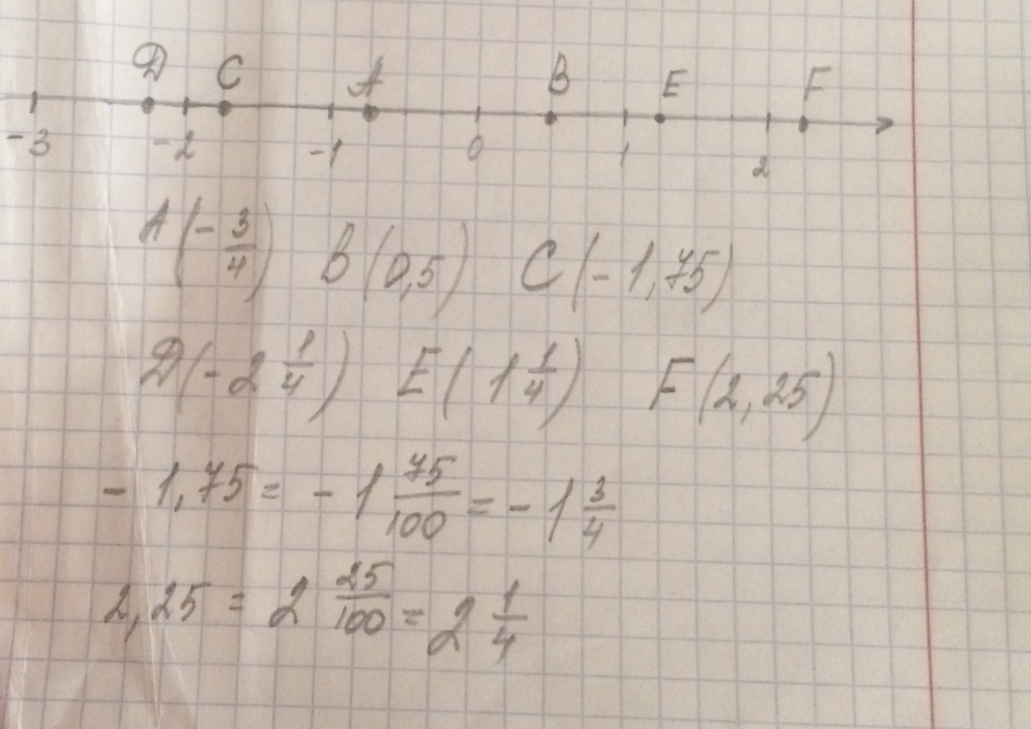 Начарти координатную прямую приняв за единичный отрезок длину 4 клеток тетради и отметь на этой прямой точки A(-3/4) B(0,5) C(-1,75) D(-2 1/4) E(1 1/4) F(2,25)