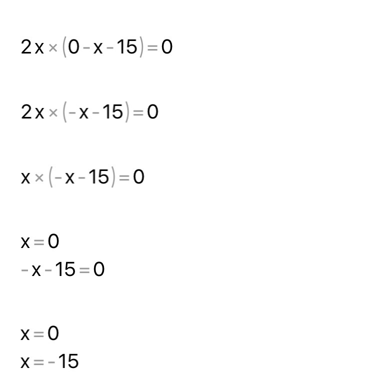 Открой скобки, приведи подобные и получится: -2х(Х+15)=0. Х1=0. Х2=-15