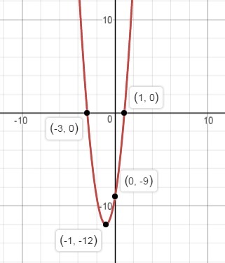 Помогитеее,парабола задана уровнем y=3x²+6x-9. Постройте параболу(просто скажите точки).Найдите координаты точек пересечения параболы с осью абсцисс.Найдите наименьшее значение функции