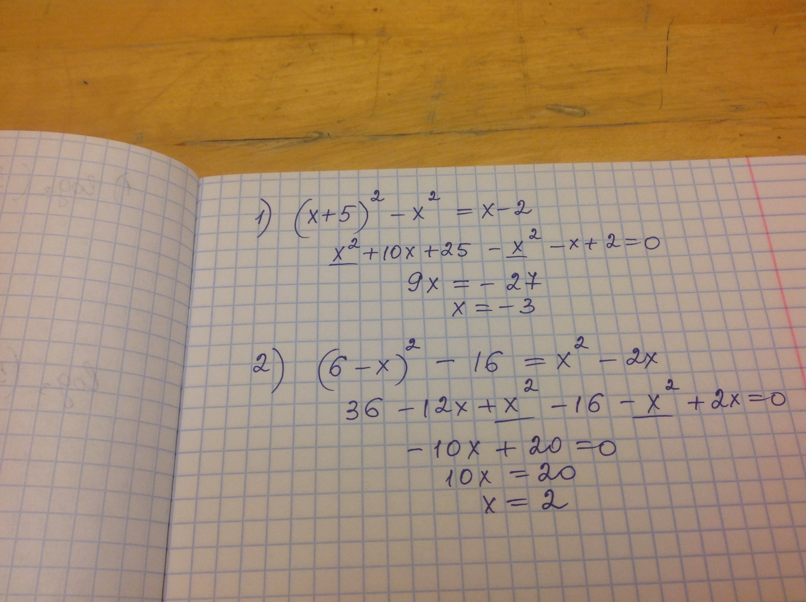 Решите уравнение: 1.(х+5)²-х²=х-2; 2.(6-х)²-16=х²-2x