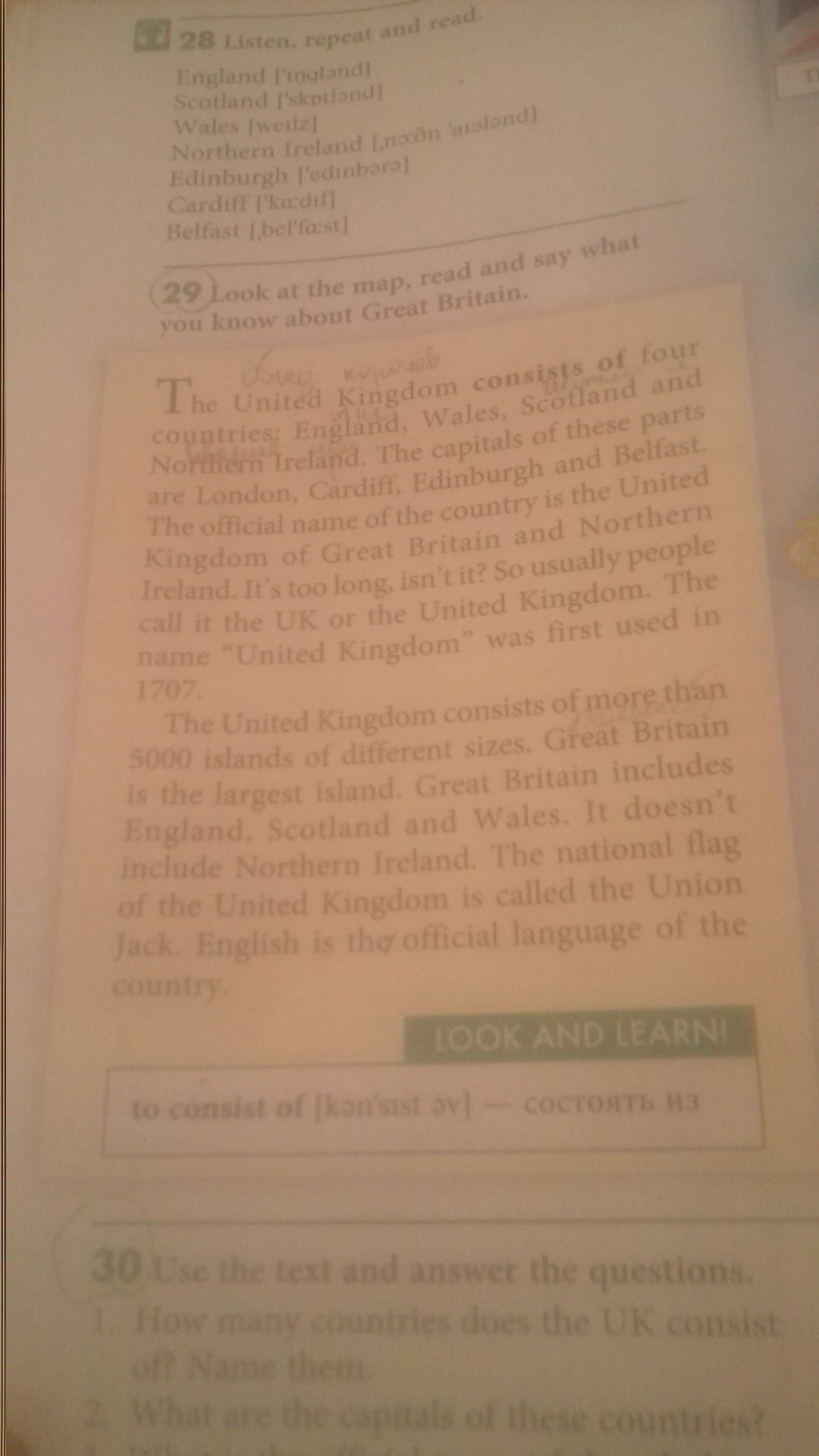 Соединенное королевство состоит из 4 стран:Англия, Уэльс, Шотландия и Северная Ирландия. Их столицы- Лондон, Кардифф, Эдинбург и Белфаст. Официальное назание страны- Соединенное Королевство Великобритании и Северной Ирландии. Слишком длинное, не так ли? поэтому обычно люди говорят the UK или united kingdom( Соединенное Королевство). Название "Соединенное Королевство" впервые использовалось в 1707 году. Соединенное Королевство состоит из более чем 5000 островов различных размеров. Великобритания- самый большой остров. Великобритания включает в себя Англию, Шотландию и Уэльс. Она не включает в себя Северную Ирландию. Национальный флаг Соединенного Королевства называют "union jack"