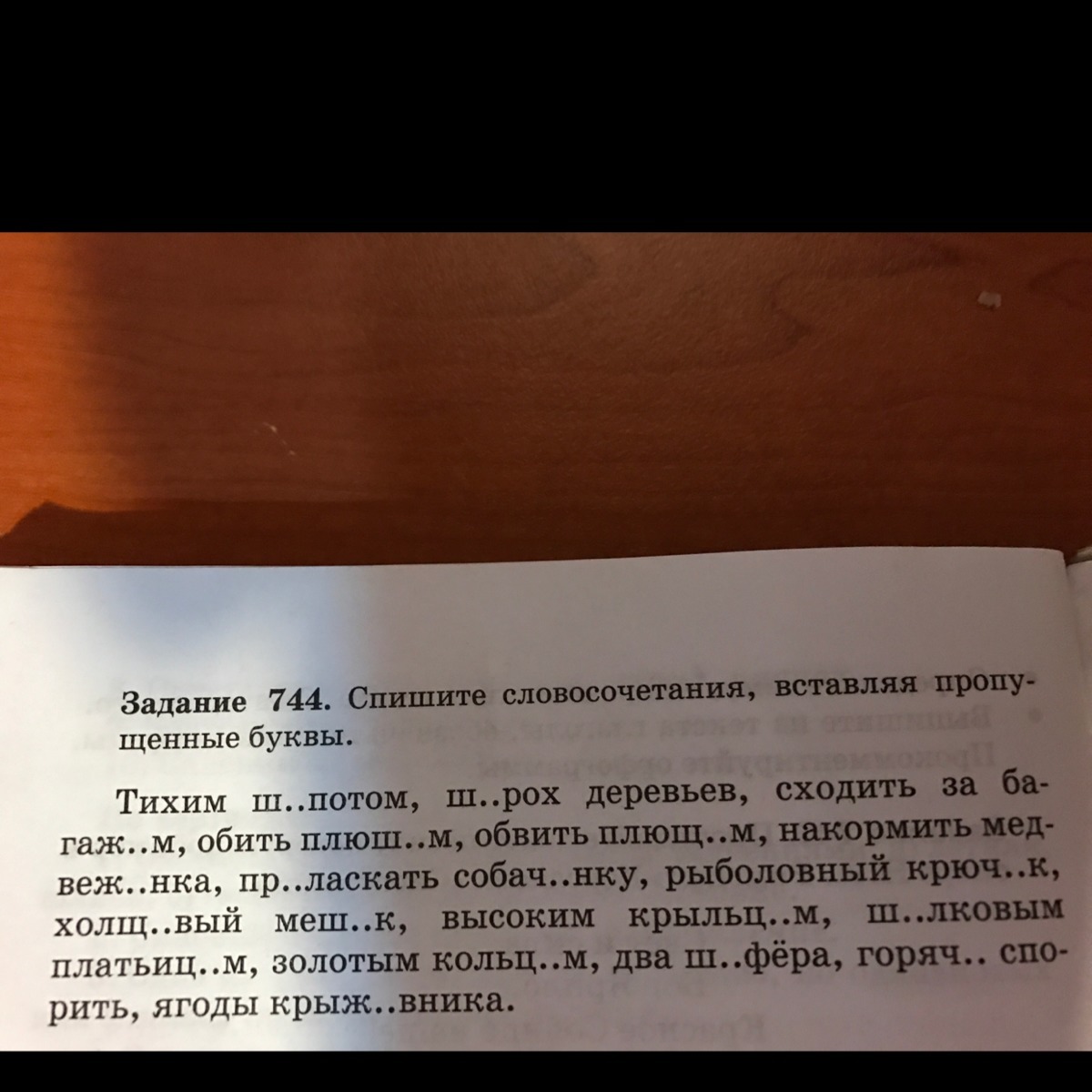 Тихим шепотом(шептать), шорох, багажом, плюшем, плющом, медвежонка, приласкать собачонку, крючок, холщовый, мешок, крыльцом, шёлковым платьицем, кольцом, шофёра, горяч спорить, крыжовника