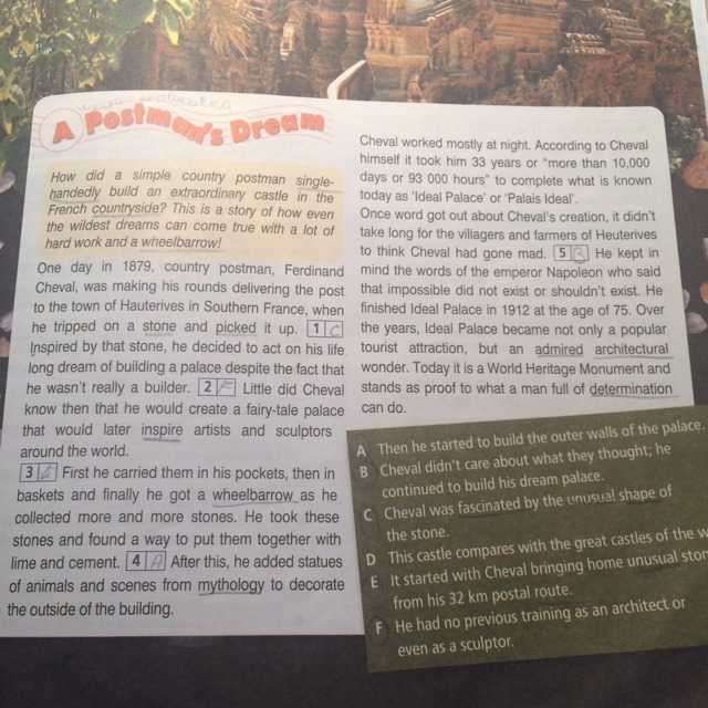 Однажды в 1879 году, страна Почтальон Шеваль работал в основном в ночное время. По словам Cheval себя, что ему потребовалось 33 года или "более 10000 страна почтальон дней или 93 000 часов" завершить то, что известно посторонней помощи построить необыкновенный замок в сегодня как идеальный дворец или Palais ldeal французской сельской местности? Это история о том, как даже однажды слово вылезли о создании Cheval, это не самые смелые мечты могут стать реальностью с большим количеством займет много времени, для сельских жителей и фермеров Heuterives тяжелой работы и думаю Cheval сошел с ума. Он держал в один день в 1879 году, страна почтальоном, Фердинанд ум слова императора Наполеона, который сказал Cheval, был обходе доставки пост, что невозможно не существовало не должно существовать. Он к городу Hauterives на юге Франции, когда закончил Идеальный дворец в 1912 году в возрасте 75 лет Над он споткнулся о камень и взял его у 1I годы, ldeal дворец стал не только популярным Вдохновленный этим камнем, он решил действовать на его жизнь туристической привлекательности, но восхищаются архитектурной давней мечты о строительстве дворца, несмотря на то, что чудо. Сегодня это памятник Всемирного наследия, и он не был на самом деле строитель, 2 Little сделал Cheval стоит как доказательство того, что человек полон решимости знают то, что он создал бы сказочный дворец может сделать. которые позже вдохновляют художников и скульпторов наружных стен Пала по всему миру. Затем он начал строить мысль: он 3 Сначала он носил их в карманах, потом в о том, что они B Cheval не волновало корзины и, наконец, он получил тачку, как он продолжал строить свою мечту дворец форму собирают все больше и больше камни. Он взял этих з Шеваль был очарован необычными камнями и нашли способ положить их вместе с каменными замками ш извести и цемента. 4 После этого, он добавил статуи D Этот замок можно сравнить с большой необычной Stor животных и сцен из мифологии, чтобы украсить E начал с Cheval принося домой, маршрут снаружи здания. из его 32 км почтовый архитектор или F У него не было никакого предыдущего обучения как еще как скульптор