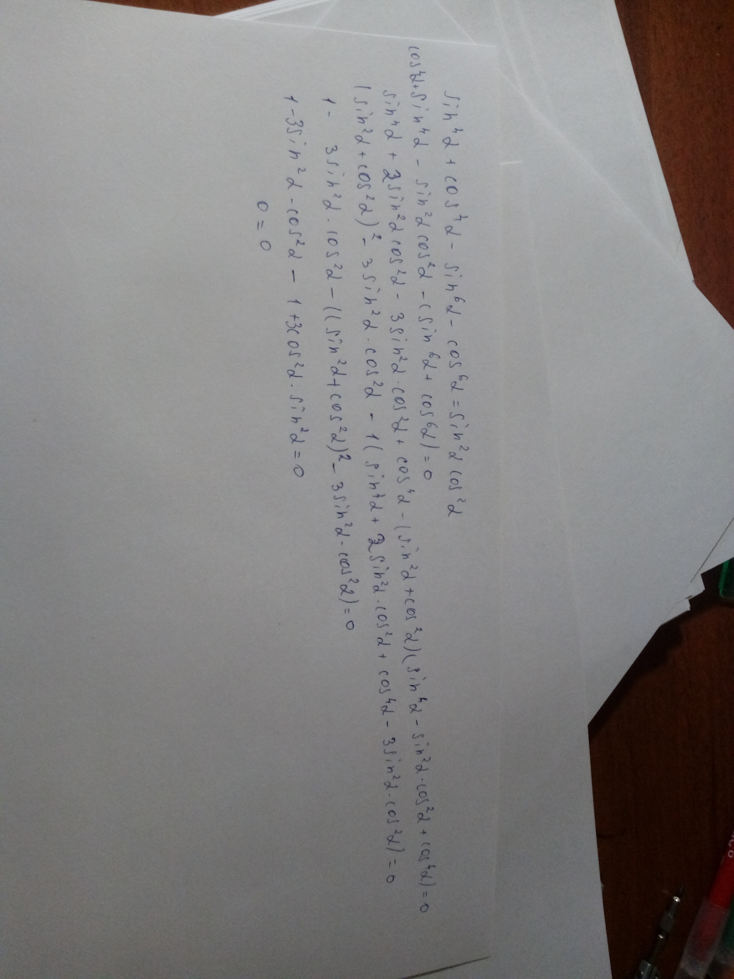 sin⁴α +cos⁴α- sin⁶α -cos⁶α= (sin⁴α -sin⁶α)+(cos⁴α -cos⁶α) =