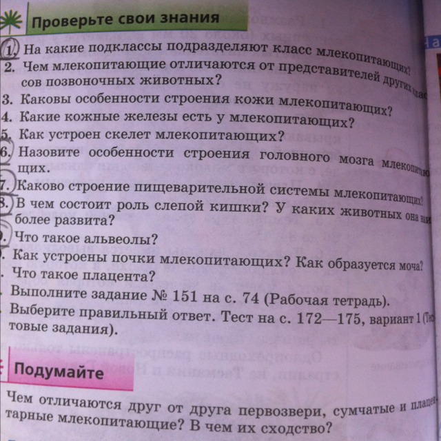 1.Класс млекопитающих подразделяются на три подкласса: Низшие звери, куда входят только два рода: Утконос и Ехидна; откладывают яйца, но выкармливают детенышей молоком; Сумчатые, которое рождают крошечных детенышей и затем вынашивают их в специальной сумке на животе; Высшие звери (Плацентарные), которые вынашивают детенышей в специальном органе-матке-до тех пор, пока они не станут достаточно зрелыми; для этого в матке формируется временный орган-плацента, с помощью которого зародыш получает питательные вещества из крови матери; этот орган и дал название всему подклассу.