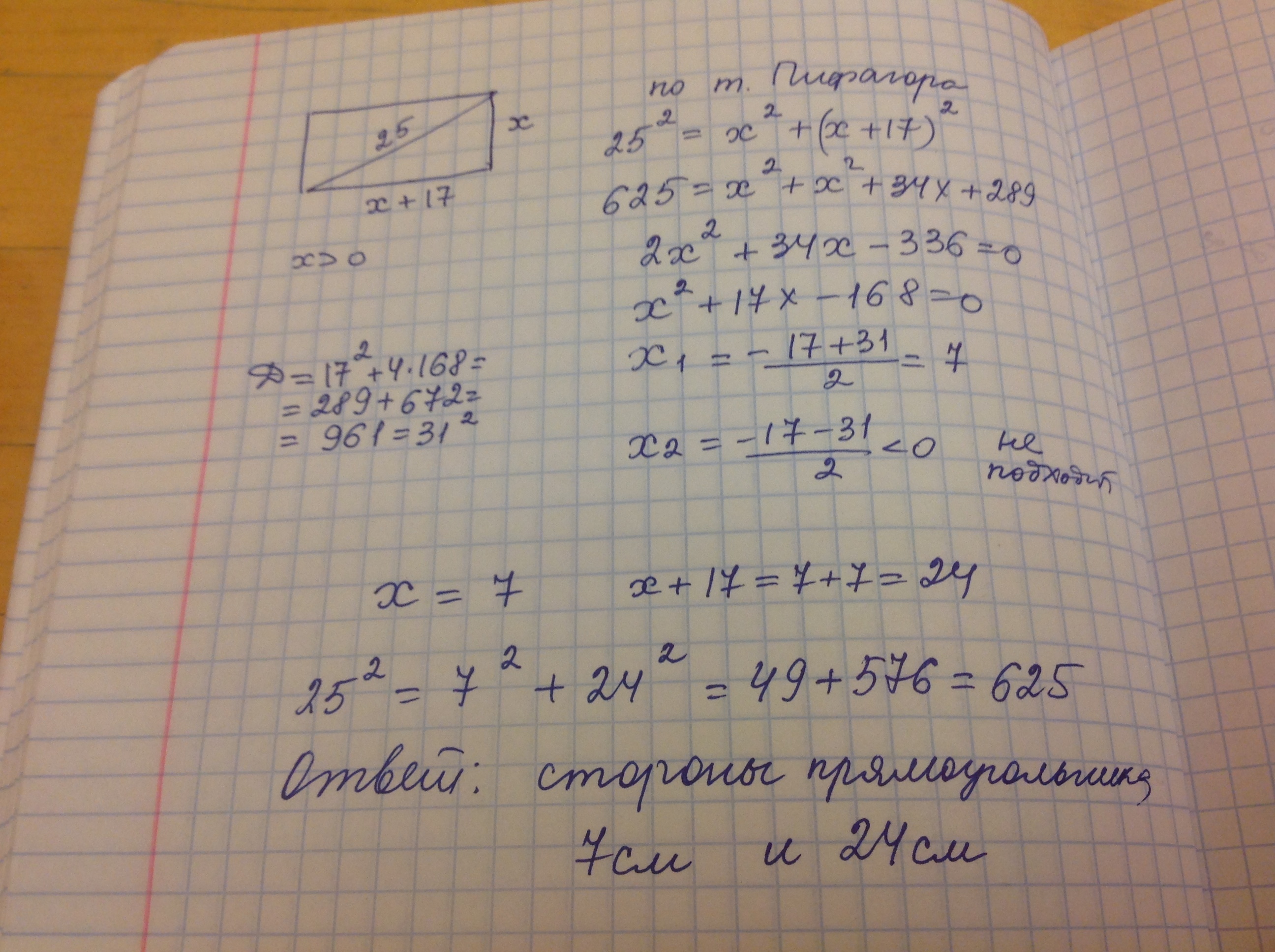 см. По условию задачи диагональ прямоугольника равна 25 см. Получим уравнение, используя теорему Пифагора: