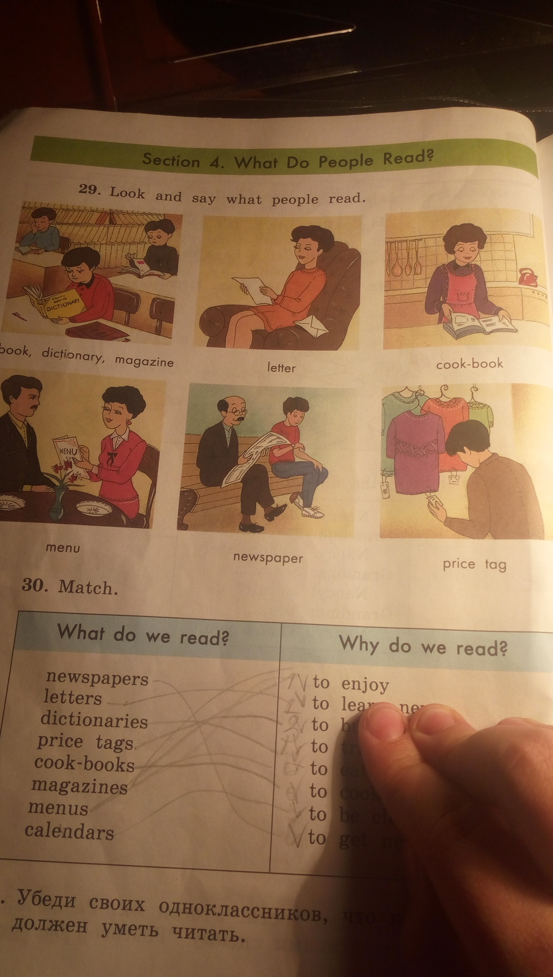 ну,если перевод - 1.словарь,журнал,книгу2.письмо,3.поваренную книгу4.менью,5.газету,6.ценник