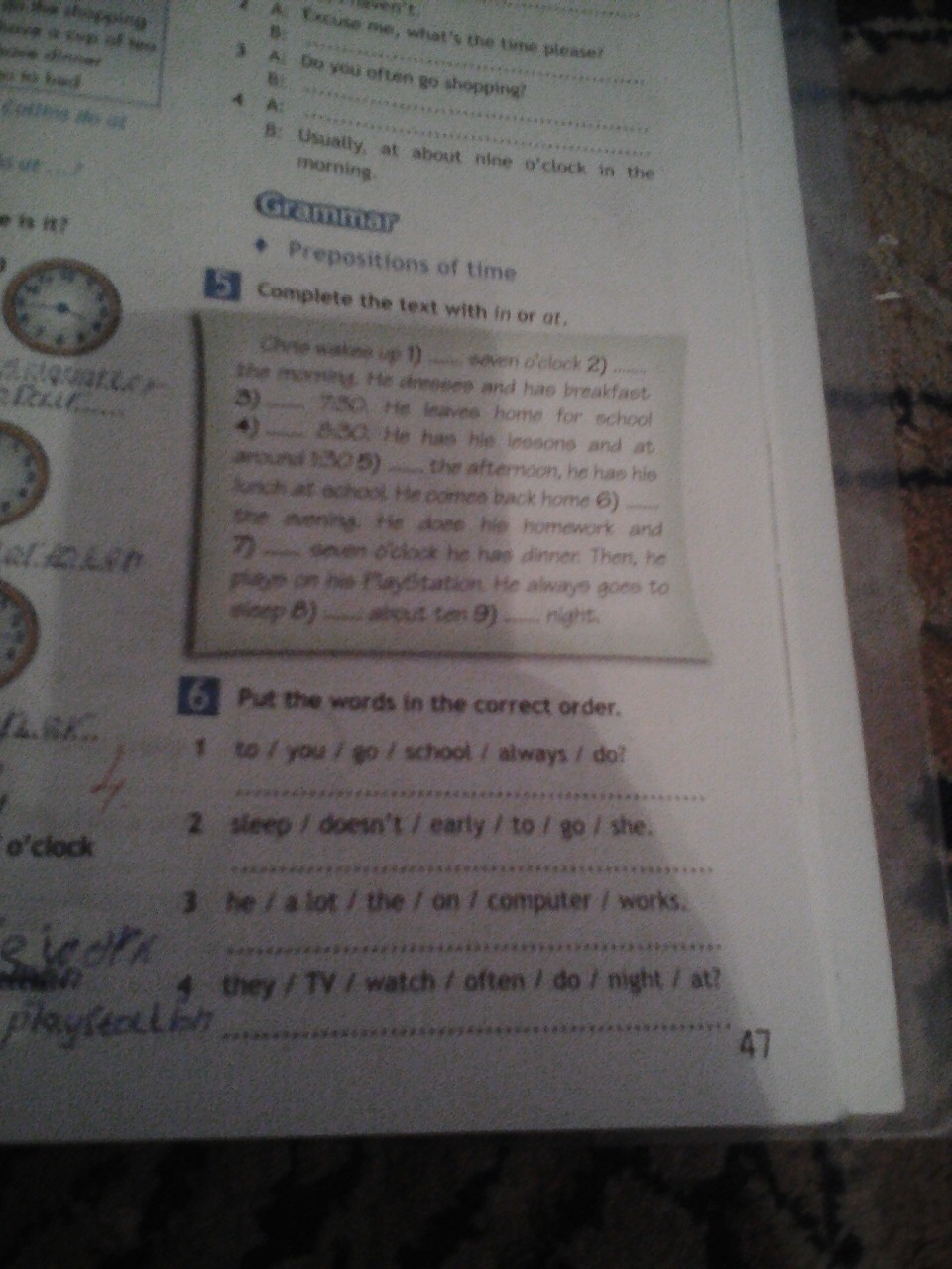 6.1.do you always go to school?6.2.she doesn't go to sleep early6.3.he works a lot on the computer6.4.do they often watch TV at night?