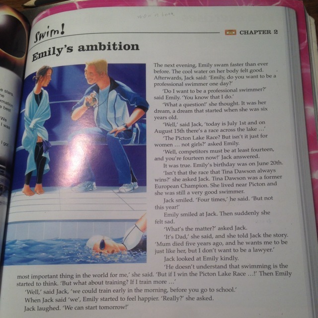 "Но разве это не для взрослых женщин?" спросила Эмили. "Ну, в соревновании можно учавствовать с 14, а тебе уже 15!" ответил Джек. Это была правда. День рождения Эмили перепадало на 20 июня. "Разве это не то соревнование, в котором всегда побеждает Тина Дасон?" спросила она Джека. Тина Дасон была бывшим чемпионом Европы. Она живет недалеко от Пиктона и до сих пор есть хорошим пловцом. Джек улыбнулся. "Четыре раза" сказал он. "Но не в этот раз!". Эмили улыбнулась, но внезапно ей стало грустно. "В чем дело?" спросил Джек. "Это папа" сказала она и поведала Джеку историю. "Мама умерла 5 лет назад, и он хотел, чтобы я была похожа на нее, но я не хотела быть юристом/адвокатом. Джек приятно улыбнулся Эмили. "Он не понимает, что плавание для меня самая важная вещь в мире. Но если я выиграю это соревнование..." она задумалась. "Но что насчет тренировок? Если я буду больше тренироваться..." "Ну, мы можем тренироваться каждый день рано утром, прежде, чем ты пойдешь в школу" Когда Джек сказал слово "мы", она почувствовала себя счастливее. "Серьезно?" Джек засмеялся. "Мы можем начать с завтрашнего дня!"