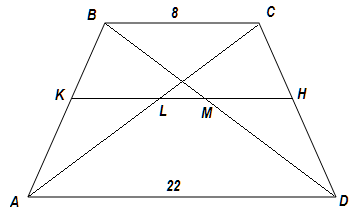 в трапеции авсд с основаниями ад=22 и вс=8, проведенасредняя линия кн, которая пересекает диогонали ас и вд в точках л и м соответственно. найти длину отрезка лм.