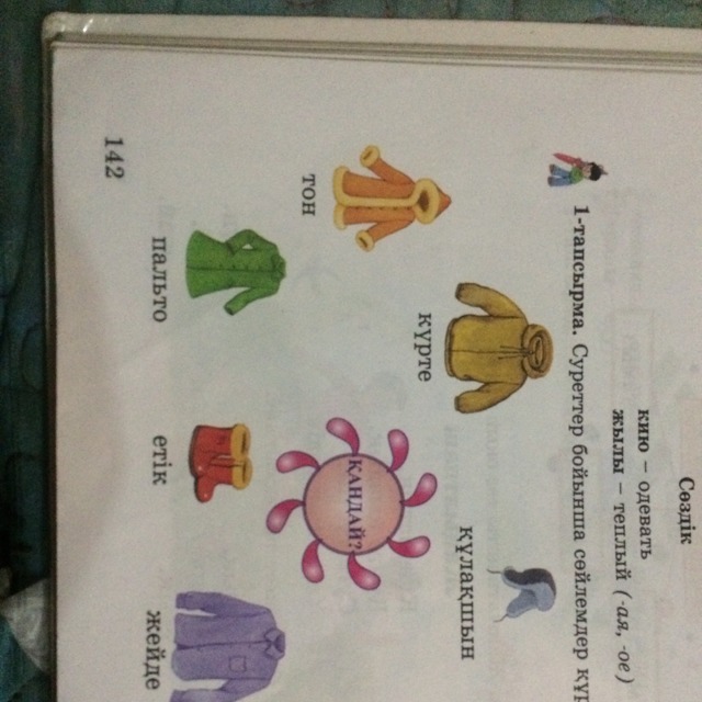 Маған анам күрте әперді.Құлақшын құлағымды тондырмайды. Менің әжем тон киеді. Әпкем пальто киіп, далаға кетті. Жейдемді бүгін мамам жуып қойды. Далада жаңбыр жауып, етігім су болды.