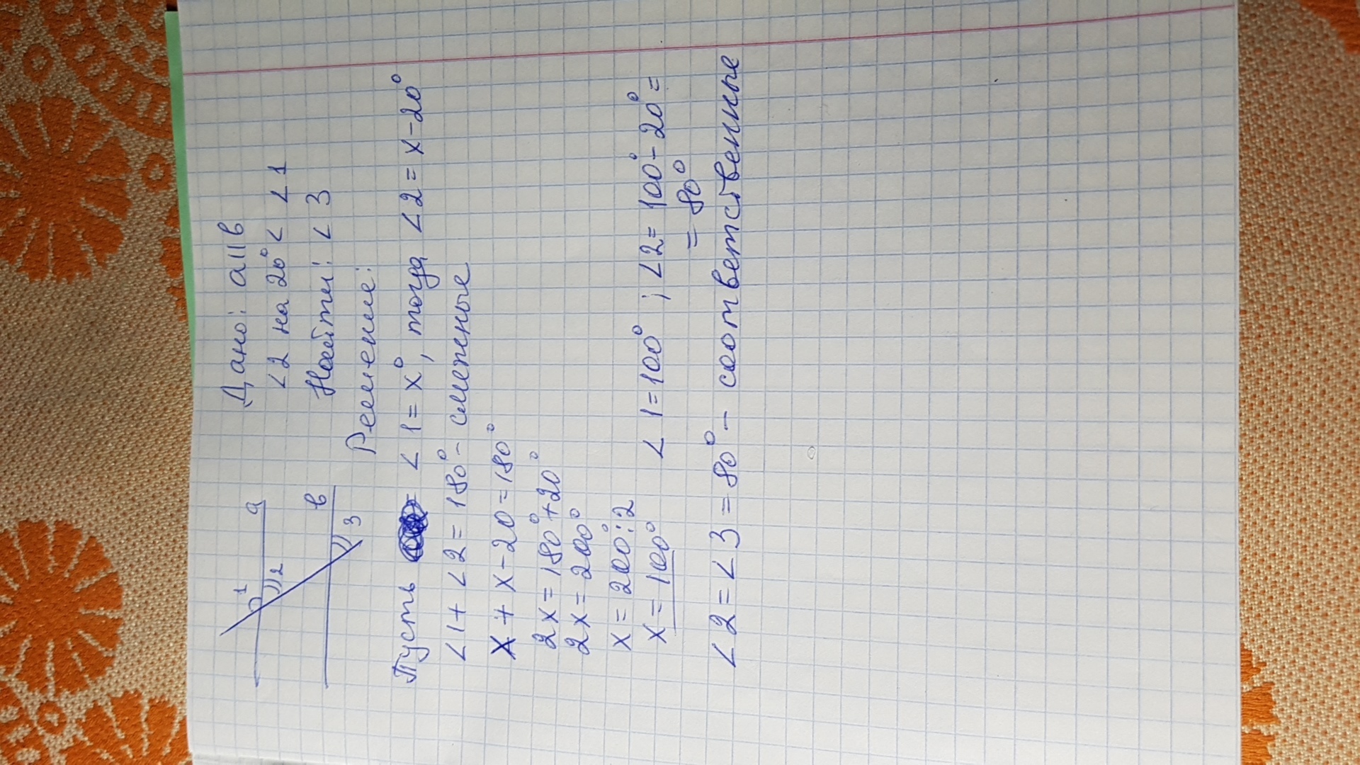 Дано:А||В угол 2 на 20 градуса меньше угла 1 . Найдите угол 3 ... ЗАДАНИЕ ПЕРВОЕ ПЛИЗЗ