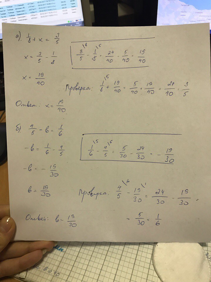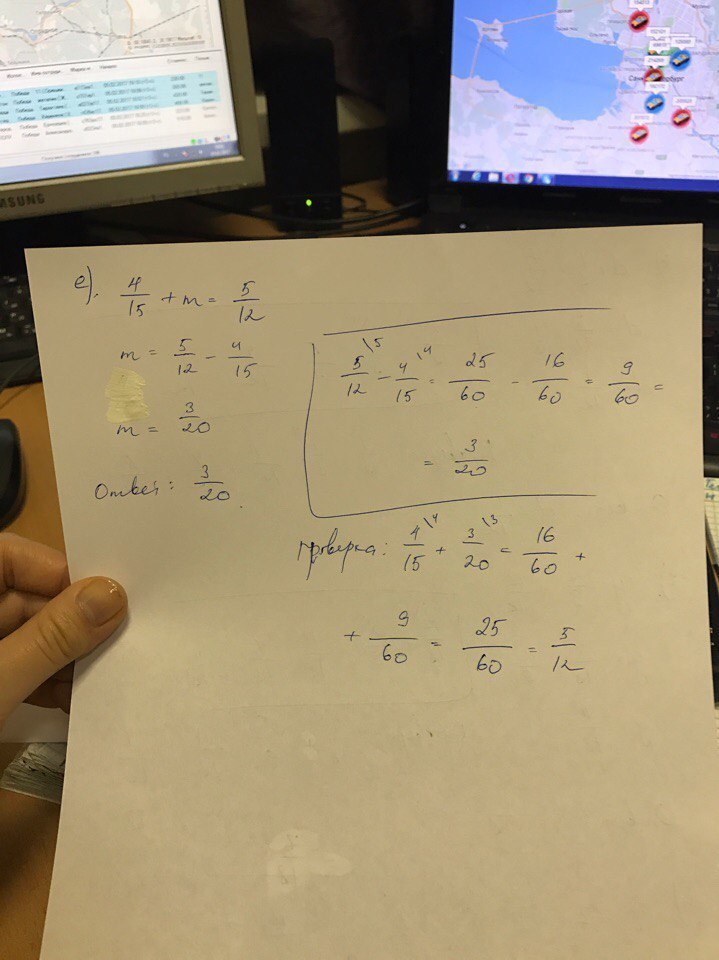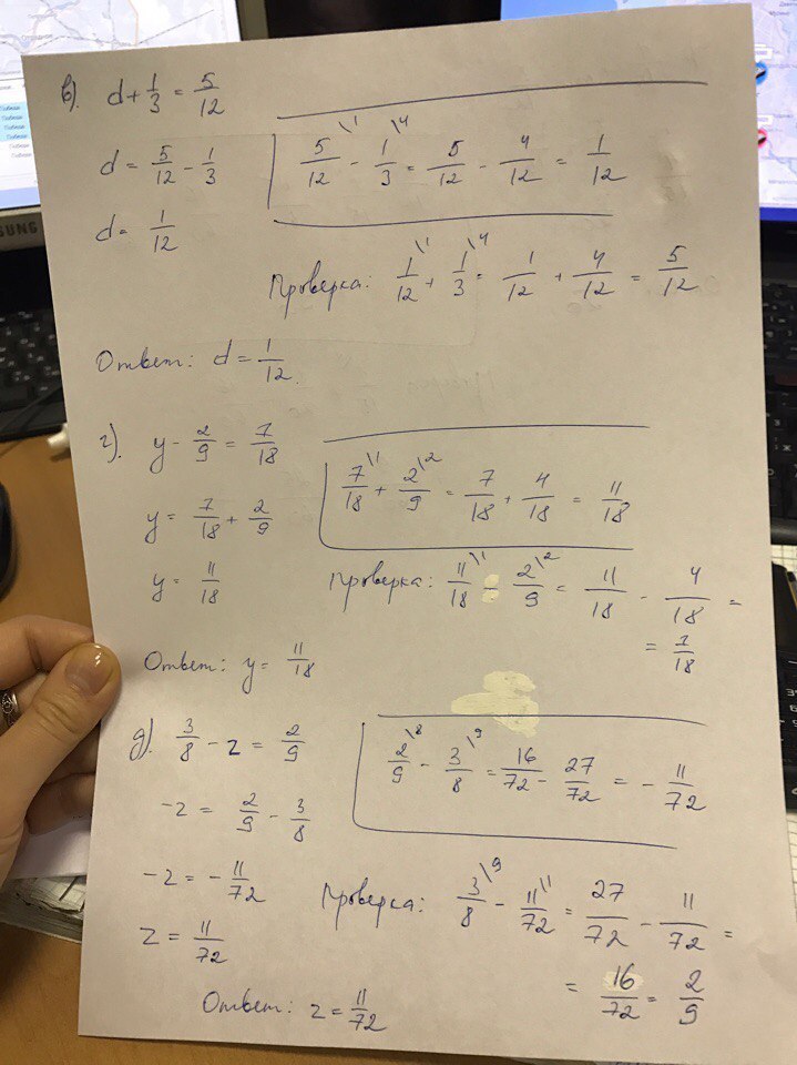 б)4/5-b=1/6 г)y-2/9=7/18 e)4/15+m=5/12