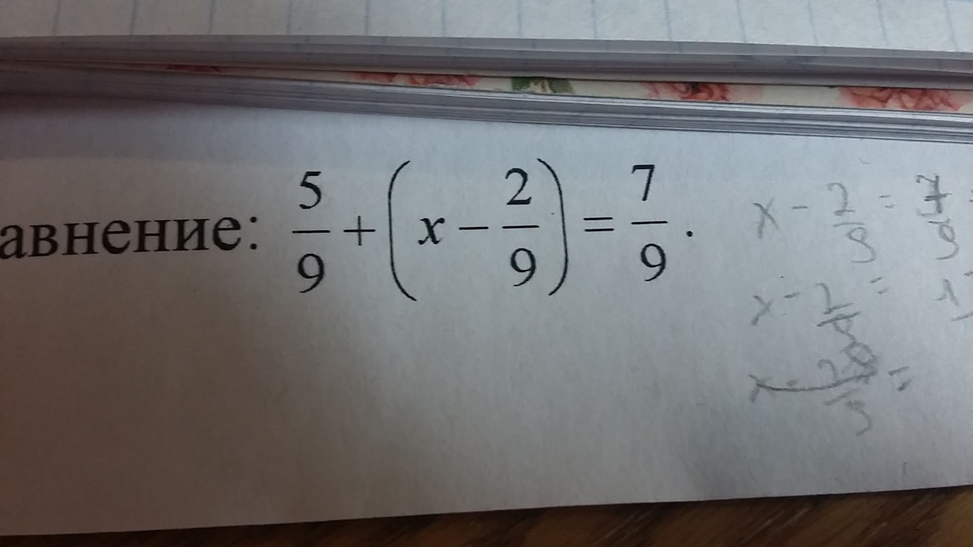 Раскрой скобки. Получишь:5/9+х-2/9=7/9