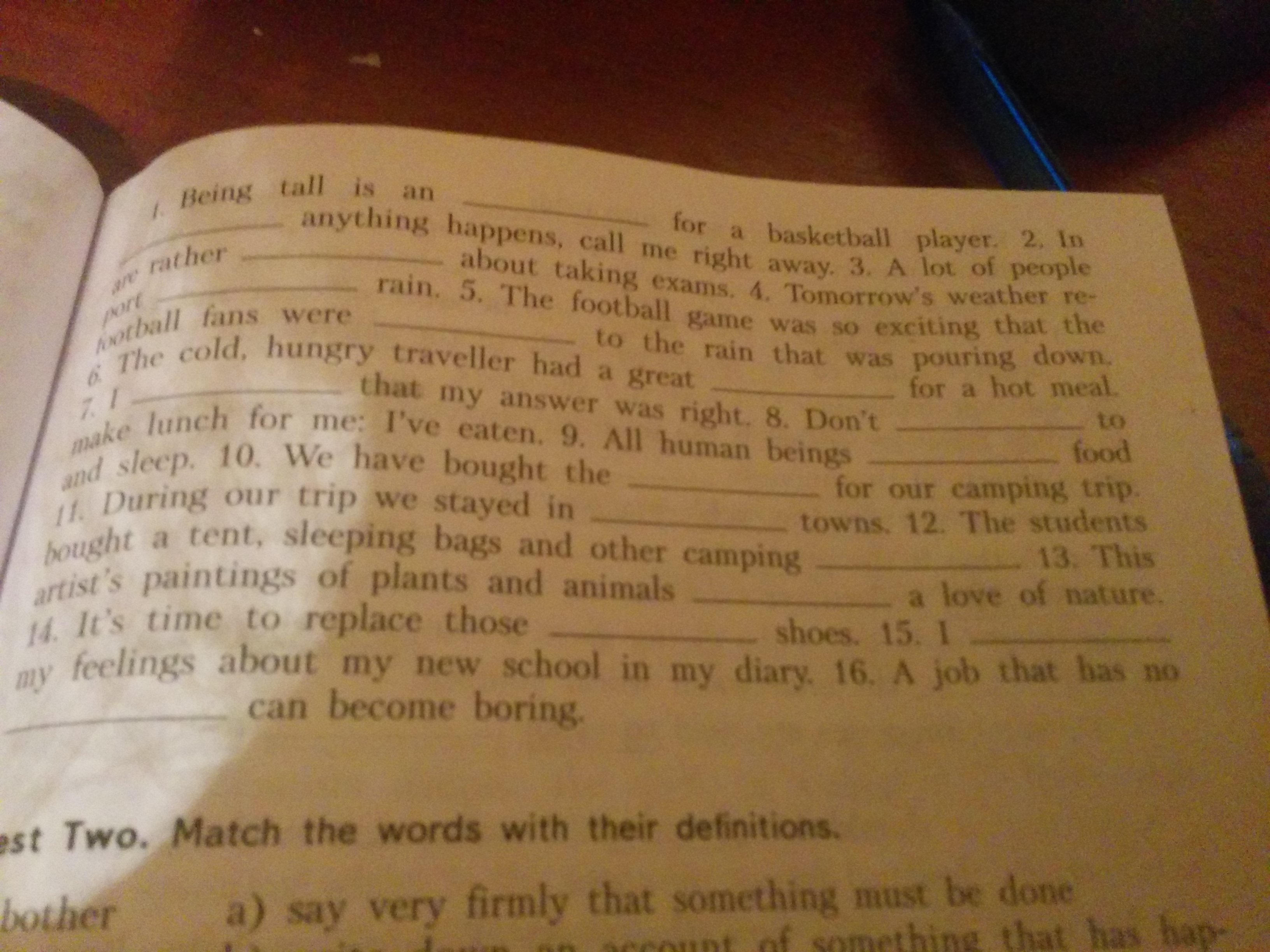Вставить слова require,variety,nervous,desire,equipment,case,bother,worn out,insists,express,supplies,indifferent,record,advantage,predict,various