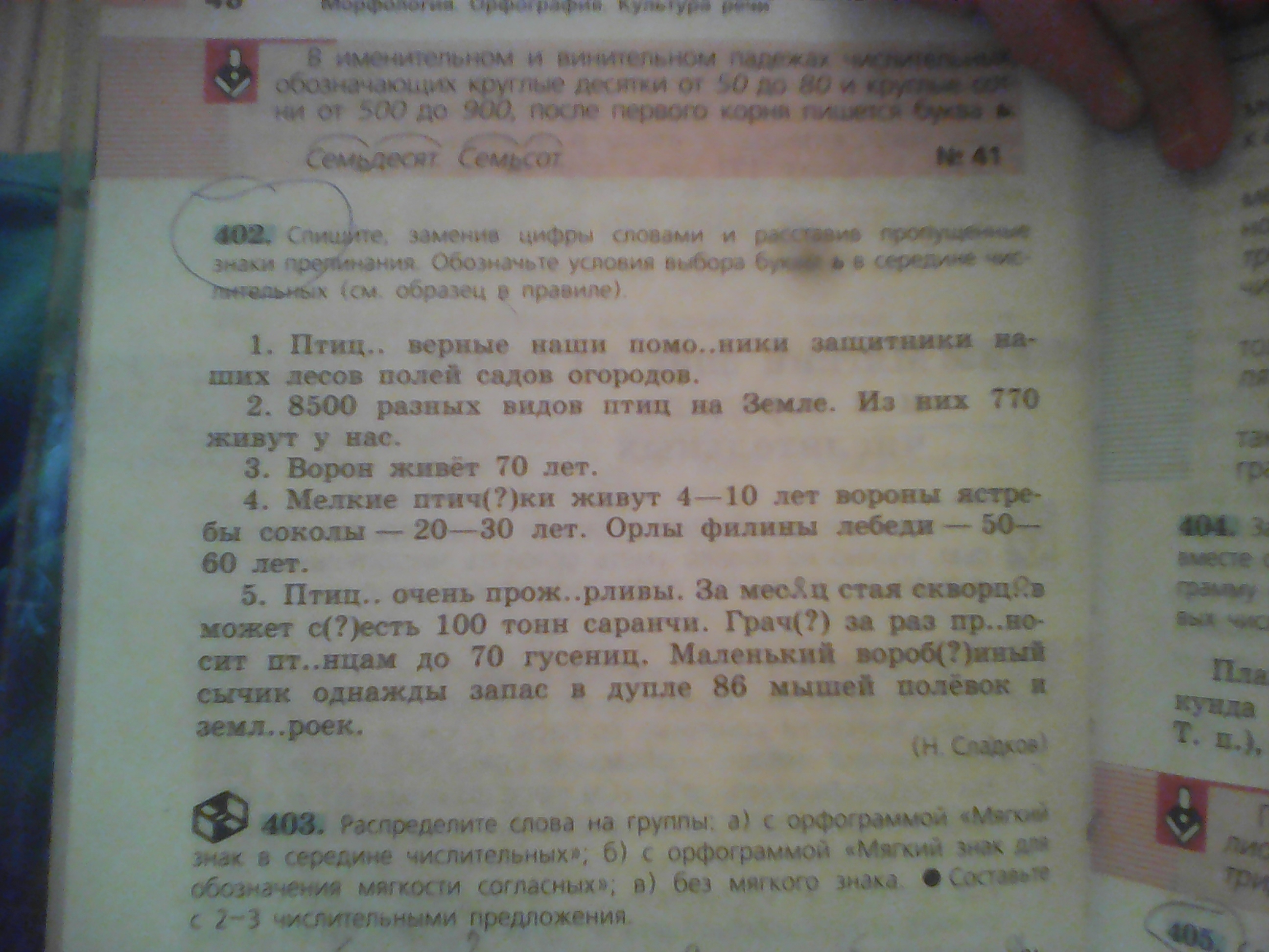 1.Птицы-верные наши помощники,защитники наших лесов,полей садоа и огородов.2.Восемь тысяч пятьсот семьсот семьдесят 3.семьдесят 4.Мелкие птички живут четыре-десять лет,вороны,ястребы,соколы-двадцать-тридцать лет.Орлы,филины,лебеди-пятьдесят-шестьдесят лет. 5.Птицы очень прожорливы.За месяц стая скворцов может съесть сто тонн саранчи.Грач за раз приносит птенцам до семидесяти гусениц.Маленький воробьиный сычик однажды запас в дупле восемьдесят шесть мышей полевок и землероек.