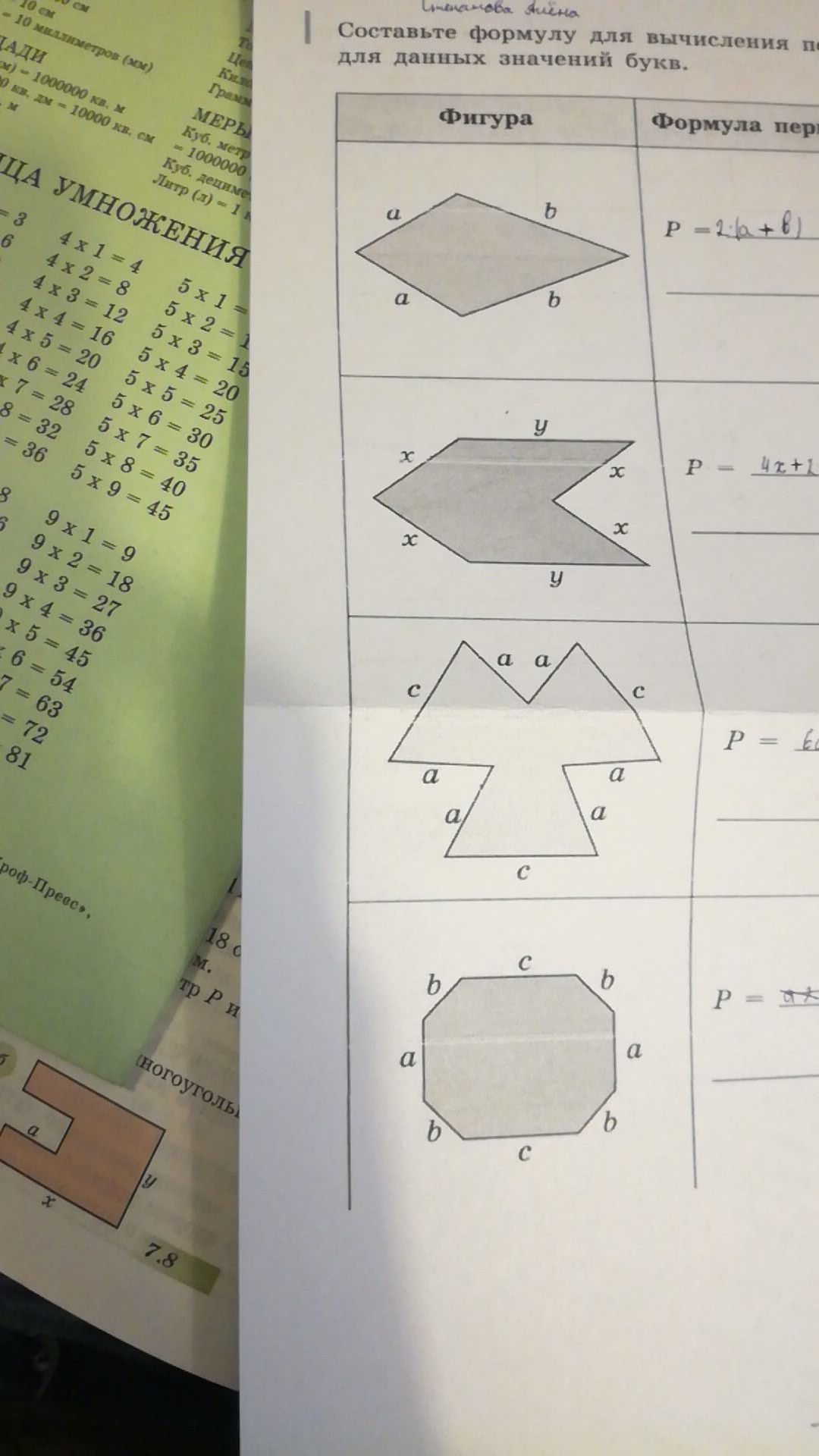 Составьте формулу для вычисления периметра фигуры и найдите периметр для данных значений букв